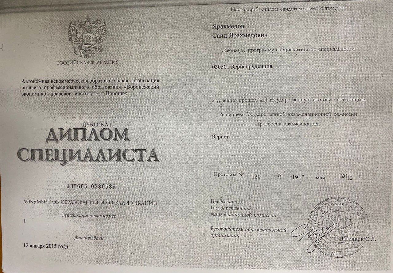 В 2016 году некогда Мартин, а теперь Саид Ярахмедов подает заявку на получение адвокатского статуса в адвокатскую палату Воронежской области. В качестве высшего образования он предъявляет диплом Воронежского экономико-правового института, в котором он учился с 2006 по 2012 года.