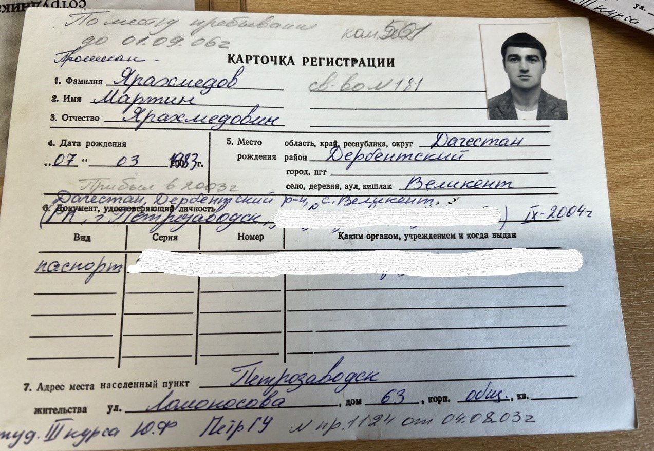 Потому что в 2003 году Мартин Ярахмедович Ярахмедов приезжает в город Петрозаводск, в котором он (если верить его второму я – Саиду Ярахмедову) никогда не был. В столицу Карелии он приезжает вместе с семьей – родителями и двумя братьями. В 2004 году Мартин поступает в Петрозаводский госуниверситет на юридический факультет и поселяется в общежитии на улице Ломоносова. Вот его карточка регистрации, где указано, что он студент ПетрГУ и что прибыл в Петрозаводск в 2003 году.