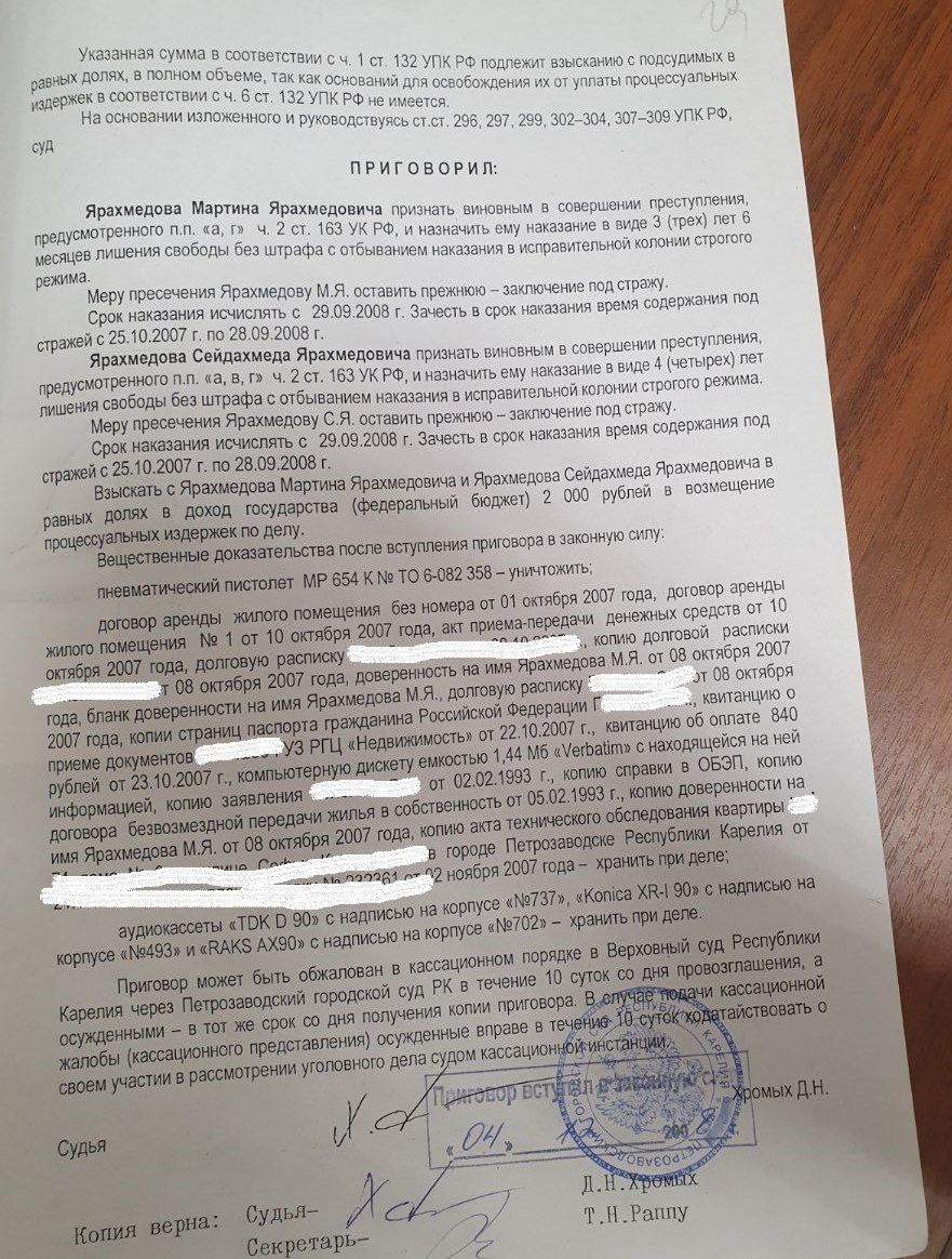 Отматываем пленку немного вперед. 29 сентября 2008 года судья Петрозаводского суда Дмитрий Хромых выносит в отношении Мартина и Сейдахмеда Ярахмедовых приговор по уголовному делу о вымогательстве (ст. 163 УК РФ), которое было совершено группой лиц по предварительному сговору в крупном размере. За год до приговора, 25 октября 2007 года, оба брата были задержаны, а потом арестованы. Судья приговаривает Мартина Ярахмедова к 3,5 годам колонии строгого (!) режима, а его брата Сейдахмеда к 4 годам также колонии строгого режима. В зале в этот момент присутствуют защитники Ярахмедовых адвокат Михаил Ямчитский и Артем Черкасов. К слову, они не могут не помнить этот процесс и сейчас, наверное, сильно удивляются, глядя на адвоката Саида из Москвы.