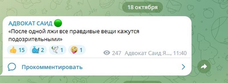 Говорят, что миллионеры и сверхуспешные люди не любят рассказывать, как получили свой первый миллион, как добились своего первого успеха. Как правило, им есть что скрывать. Они потом могут совершить множество хороших дел, подняться на самый верх. Но все равно тот самый осадок будет всегда с ними, потому что, как правильно написал Саид Ярахмедов на своей странице 18 октября 2023 года – «После одной лжи все правдивые вещи кажутся подозрительными». Лучше и не скажешь!