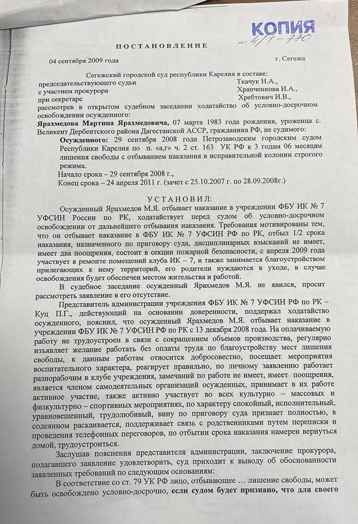 Студенческие конференции, активный студент. Да, активный, но не студент, а заключенный ИК-7. Читаем постановление Сегежского городского суда от 4 сентября 2009 года об условно-досрочном освобождении Мартина Ярахмедова. Руководством исправительной колонии №7 в Сегеже характеризуется положительно, взысканий не имеет, работает разнорабочим в клубе, имеет поощрения, участвует в самодеятельности и даже состоит в секции пожарной безопасности. В содеянном раскаивается, намерен вернуться домой, трудоустроиться. В общем, вину признал и искупил.