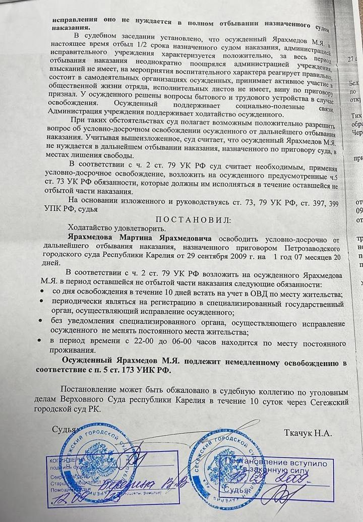 Решением от 29 сентября 2009 года суд решает отпустить Мартина Ярахмедова на свободу по УДО.