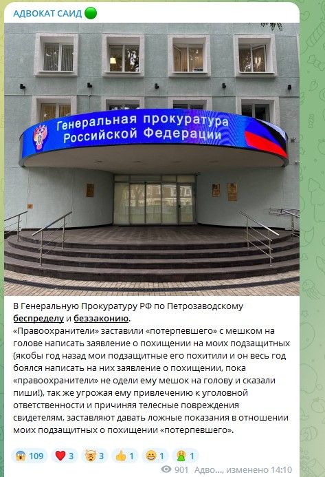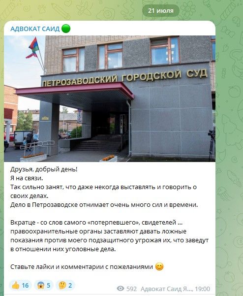 Уже в июле на своей странице адвокат Саид писал, что дело в Петрозаводске отнимает у него очень много сил и времени, что правоохранительные органы заставляют потерпевших давать ложные показания против его подзащитного, угрожая им, что заведут в отношении них уголовные дела. Сообщение было опубликовано с хэштегами «беспредел» и «беззаконие». В августе в его соцсетях появилась информация, что он обратился в Генеральную прокуратуру РФ по «беспределу и беззаконию» в Петрозаводске. В общем, братья Кадашевы, как тот самый Рафик из Comedy Club, ни в чем не виноваты. Это силовики идут против закона.