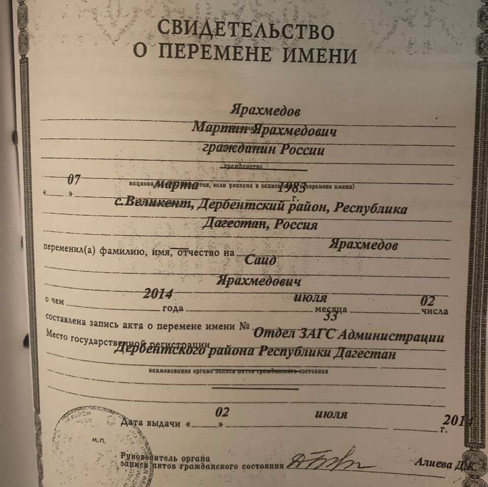 Итак, адвокат Саид Ярахмедович Ярахмедов до 2014 года носил другое имя – Мартин Ярахмедович Ярахмедов. Дата рождения та же – 7 марта 1983 года. Имя он поменял в 2014 году. Копия свидетельства о смене имени есть в нашем распоряжении. В его автобиографии, которую он предоставил для получения статуса адвоката в Воронежскую коллегию адвокатов в 2016 году, он уже Саид Ярахмедов.