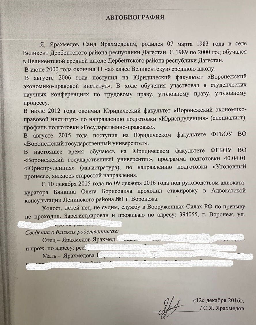 Саид также рассказывает палате, что в 2015 году он поступил на юрфак Воронежского государственного факультета, где и учится на момент подачи заявления на получение статуса адвоката. В общем, получает человек зачем-то второе юридическое образование, хотя, скорее всего, первое.
