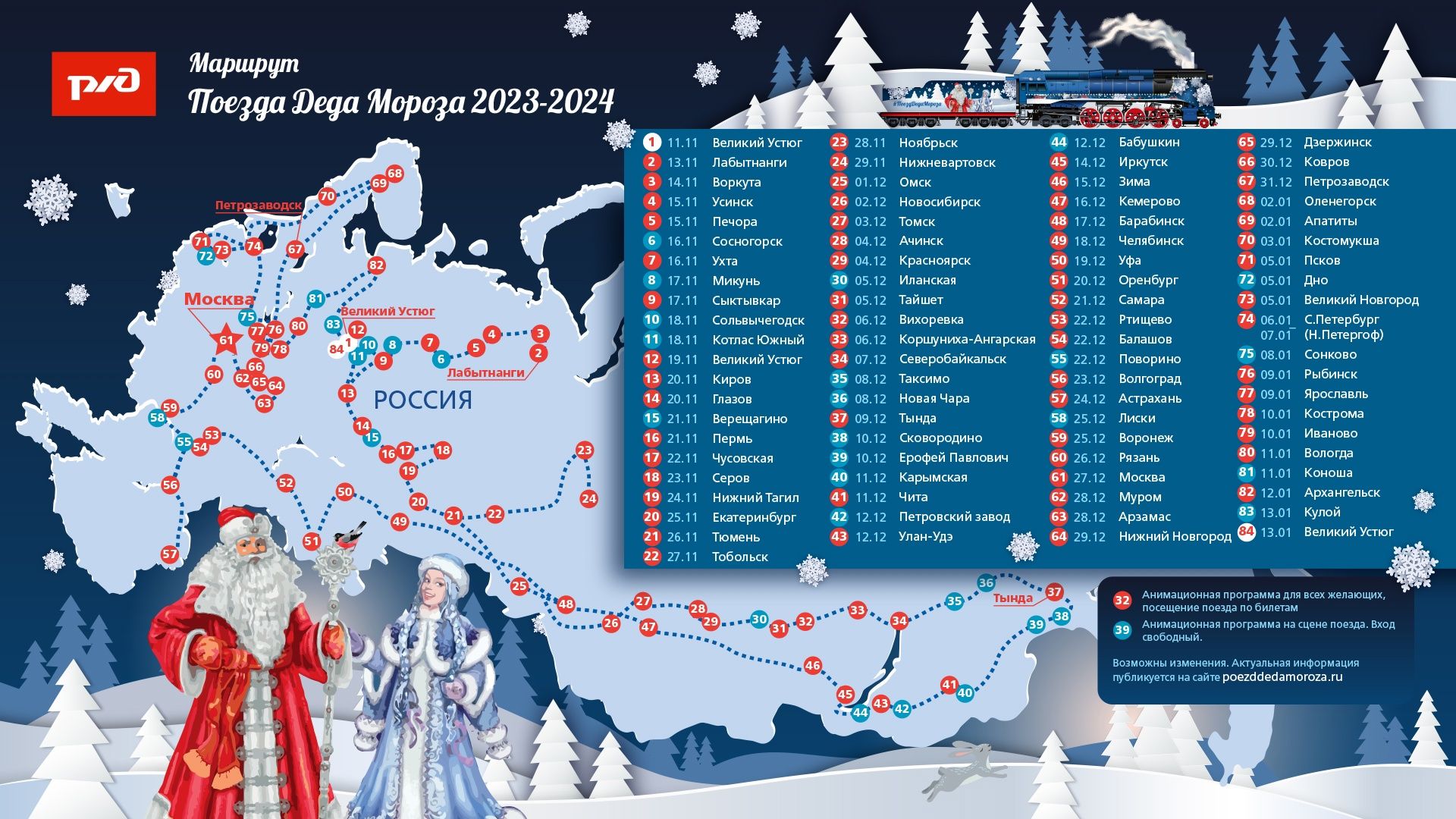 На вокзалах зрителей будет ждать праздничная программа с участием артистов и аниматоров. Организаторы обещают привезти в города зимнюю сказку и новогоднее волшебство.