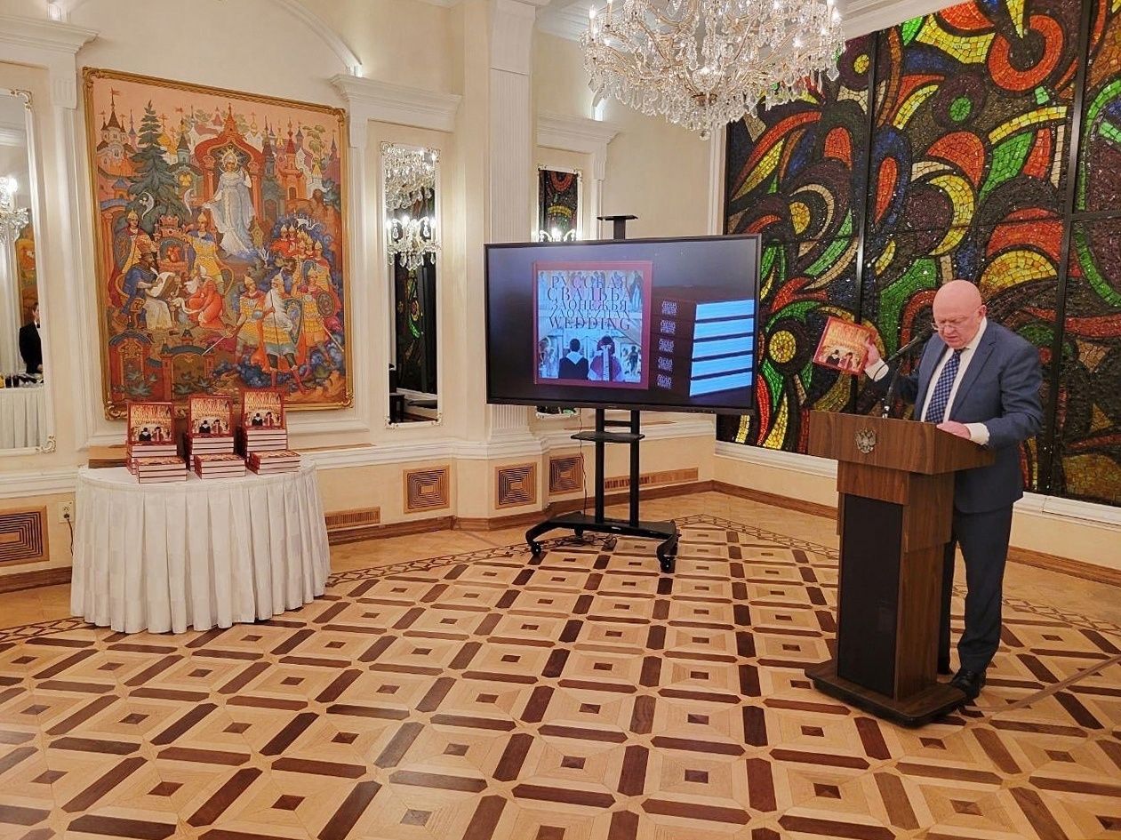 Под эгидой Комиссии РФ по делам ЮНЕСКО вышло в свет уникальное, богато иллюстрированное издание «Русская свадьба Заонежья». На днях ее презентовали в представительстве ООН в Нью-Йорке. Ее представил полномочный представитель РФ при ООН Василий Небензя.