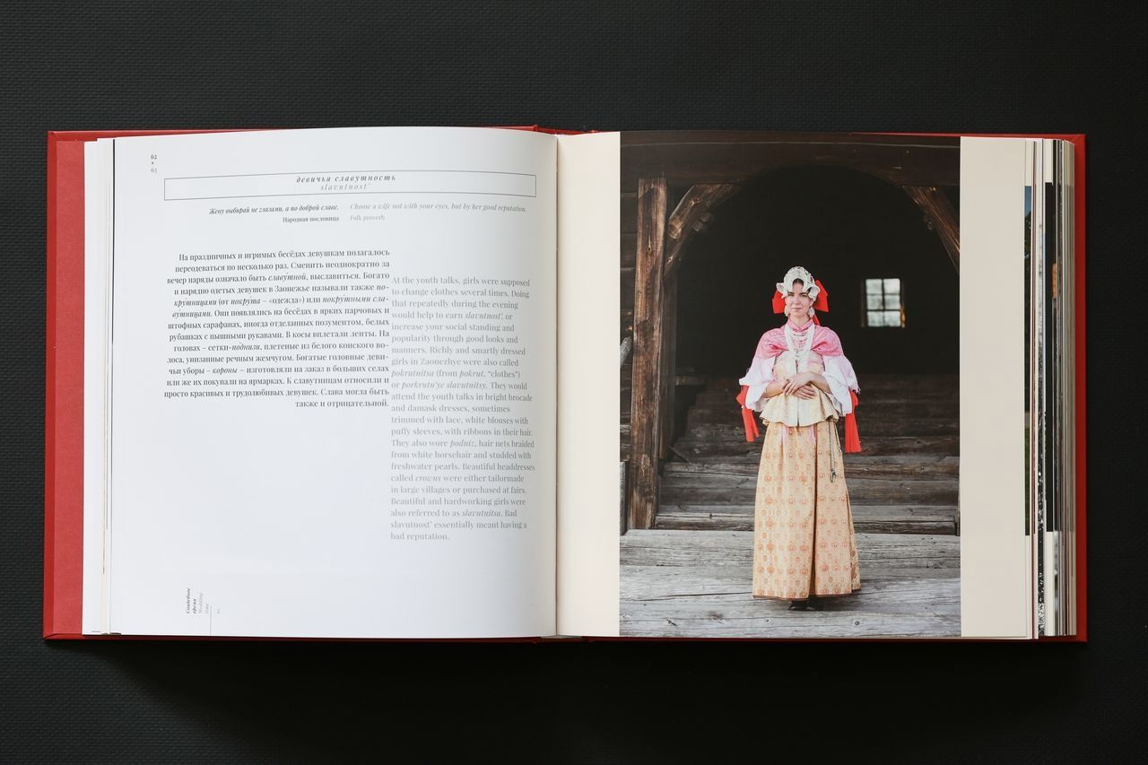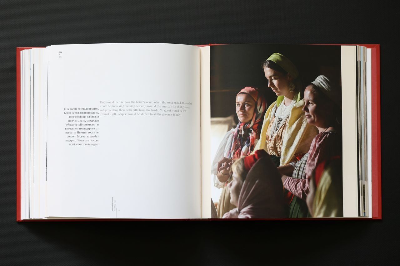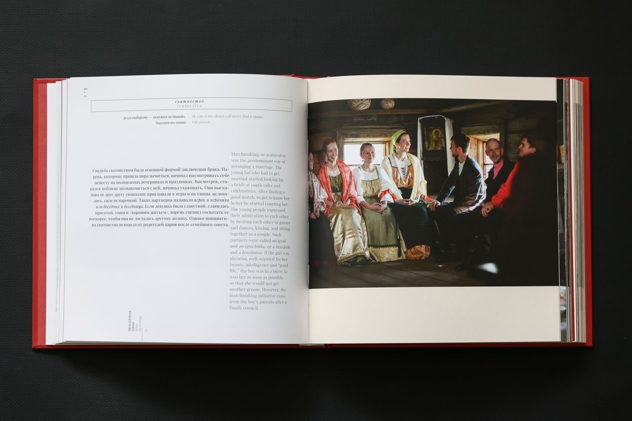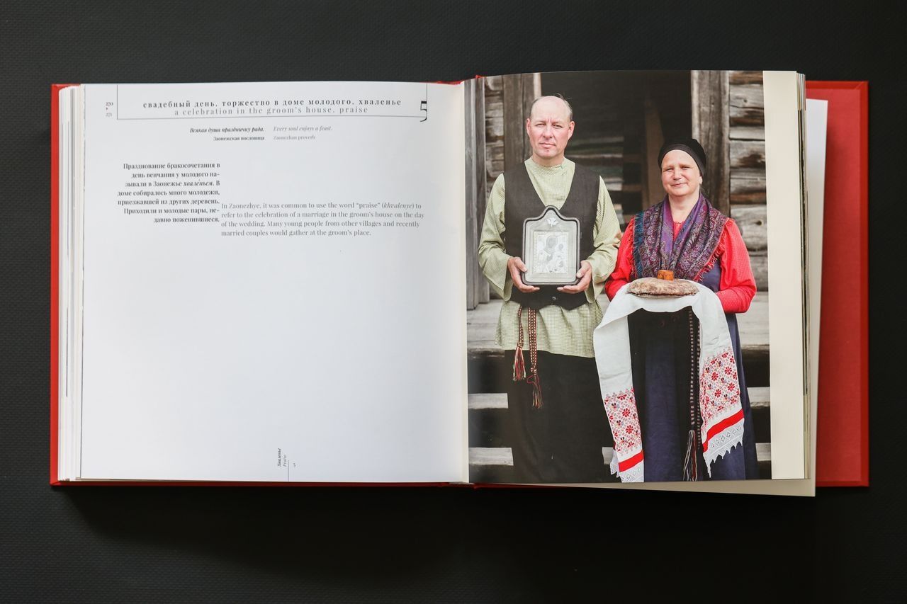 В рамках проекта была реконструирован традиционный свадебный обряд русских Заонежья конца XIX – начала ХХ вв. Был также снят фильм. Съемка обряда – в исторических интерьерах и на территории крестьянских усадеб – легла в основу книги. С видео можно ознакомиться в процессе чтения, благодаря QR-кодам в тексте. Кроме того, в книгу вошли архивные фотографии жителей Заонежья и Олонецкой губернии. Текст подготовлен на русском и английском языках.