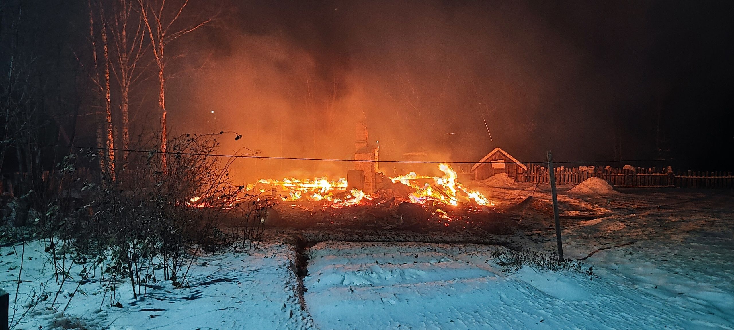 По прибытию первых пожарных подразделений здание было охвачено огнём полностью, сильное задымление, но огнеборцы отстояли у огня близстоящие хозяйственные постройки, – говорится в сообщении паблика спасателей.