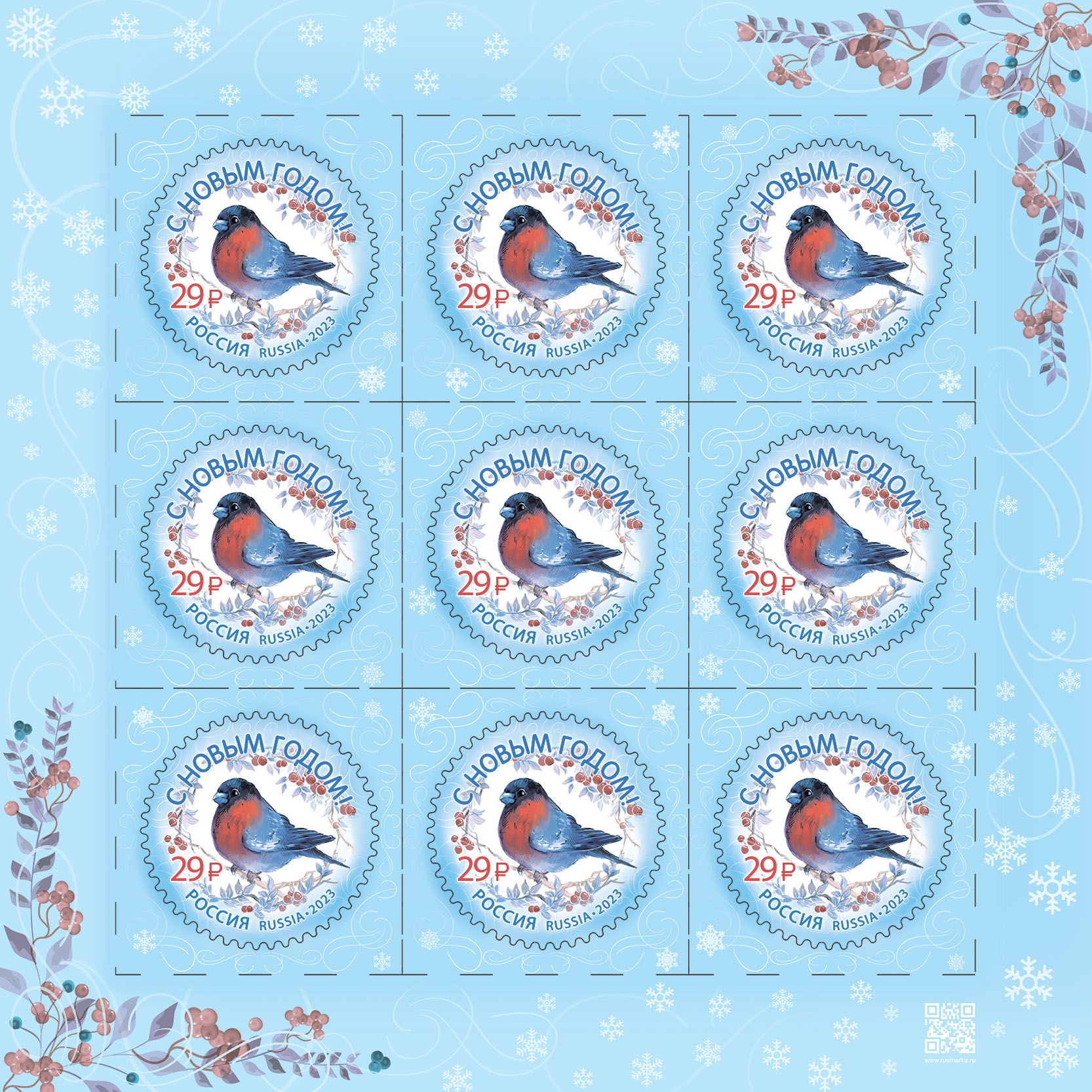 Сегодня, 5 декабря, в почтовое обращение вышла марка «С Новым Годом!». На ней на фоне снежных узоров изображён снегирь и веточки с ягодами рябины.