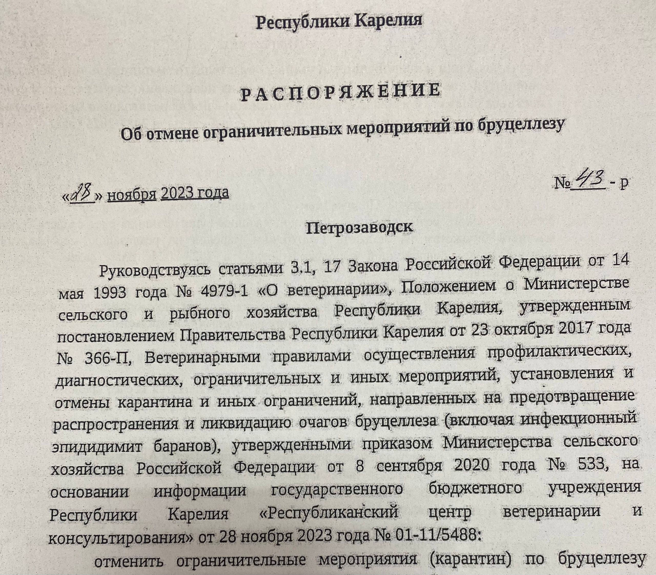 Об этом сообщает администрация Нововилговского сельского поселения, которая получила ответ на запрос от Министерства сельского и рыбного хозяйства. Согласно распоряжению ведомства, карантин по бруцеллезу был отменен еще 28 ноября.