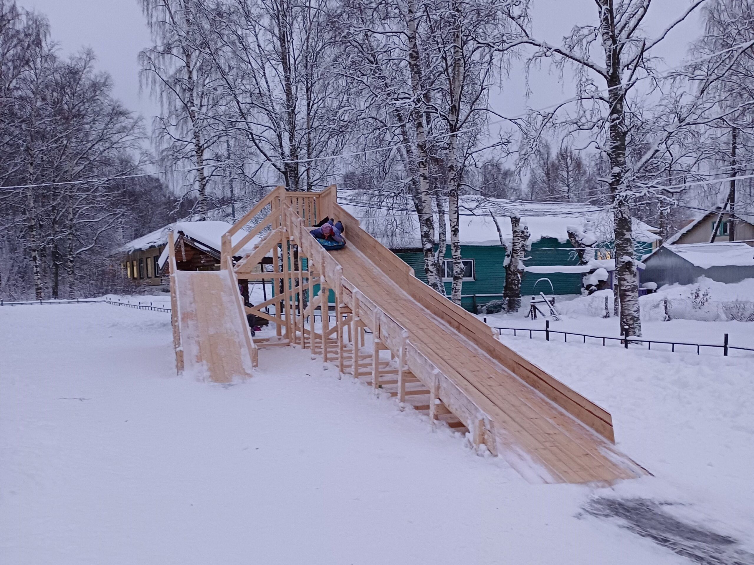 Двускатную деревянную горку построился в Пряже. Деньги собрал фонд «Мельница» на «Круге благотворителей». Это мероприятие, где местные жители обсуждают инициативы и скидываются на их реализацию.