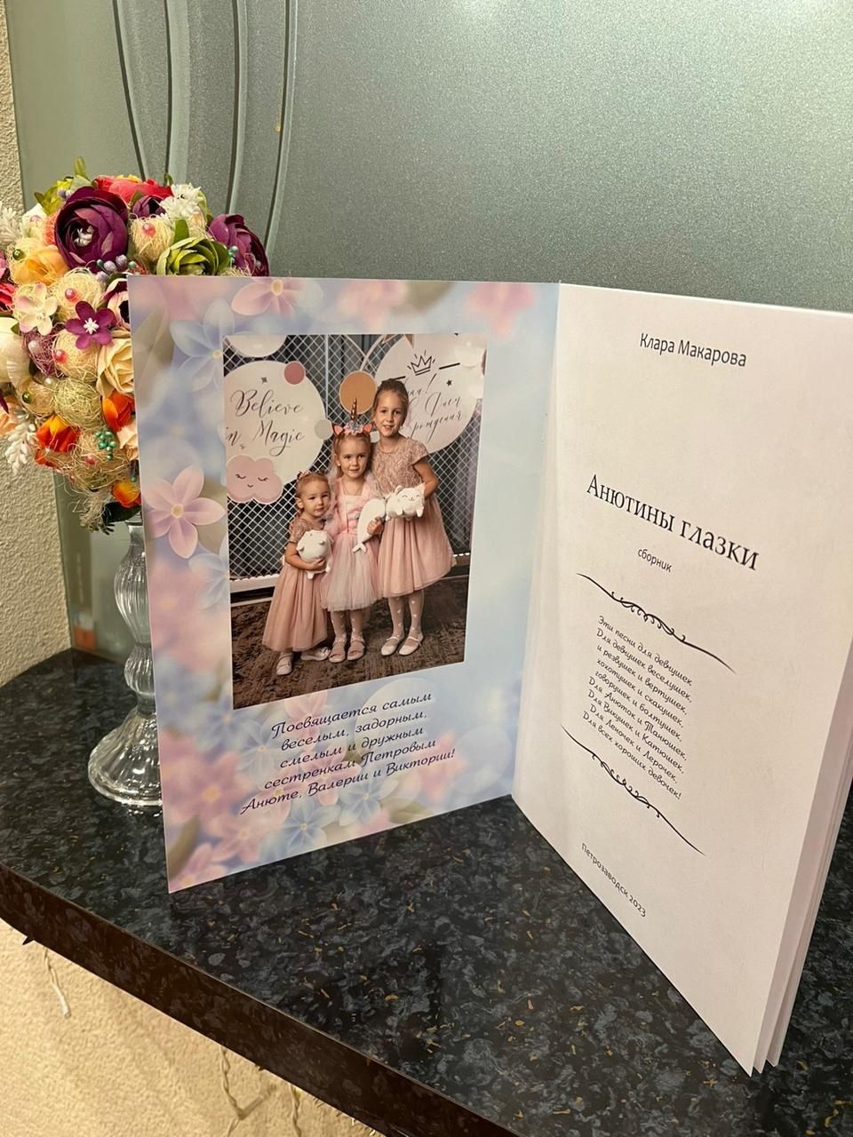 Этот год для меня оказался поистине счастливым. Потому что мне довелось встретить доброго волшебника, который осуществил мою давнюю мечту и помог выпустить тираж книг «Анютины глазки». Это сборник детских песен для девочек. Он просто зажёг для меня в небе звезду и помог поверить в чудо. Чтобы звезда освещала мой творческий путь, ведь если в небе зажигаются звезды, значит это кому-нибудь нужно. Да нужно! Этот добрый волшебник — заместитель руководителя компании «КарелИмпэкс» Павел Петров. Спасибо ему огромное за его доброту.