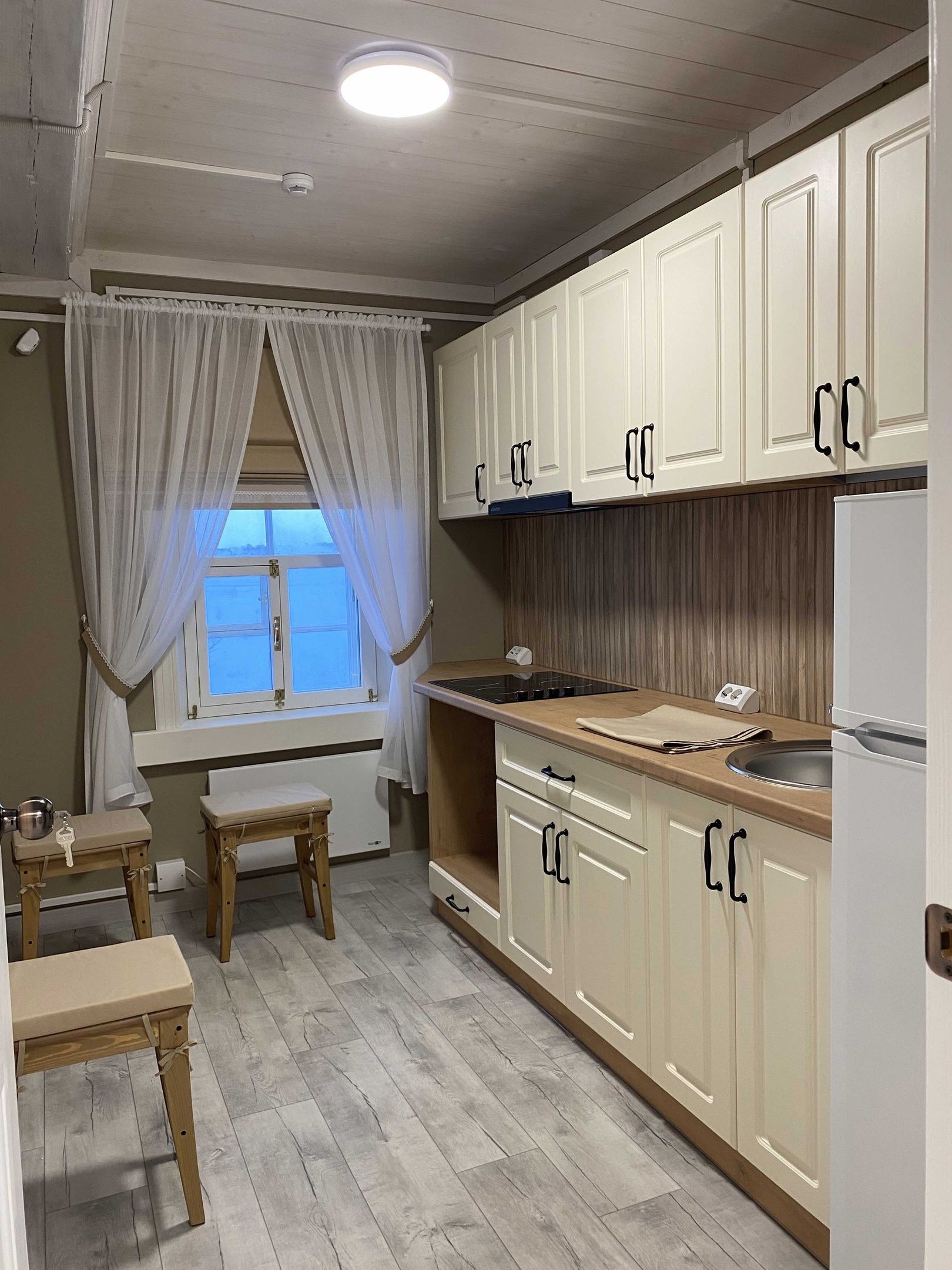 Двухэтажный дом, расположенный в деревне Дудниково на Заонежском полуострове в прямой видимости Кижского погоста, вмещает 11 жилых, полностью меблированных квартир, включающих жилые комнаты и кухни с горячим водоснабжением. На этажах расположены туалеты и душевые комнаты. Есть в доме и хозяйственные комнаты со стиральными машинами, и общие помещения – например, большой зал на втором этаже.