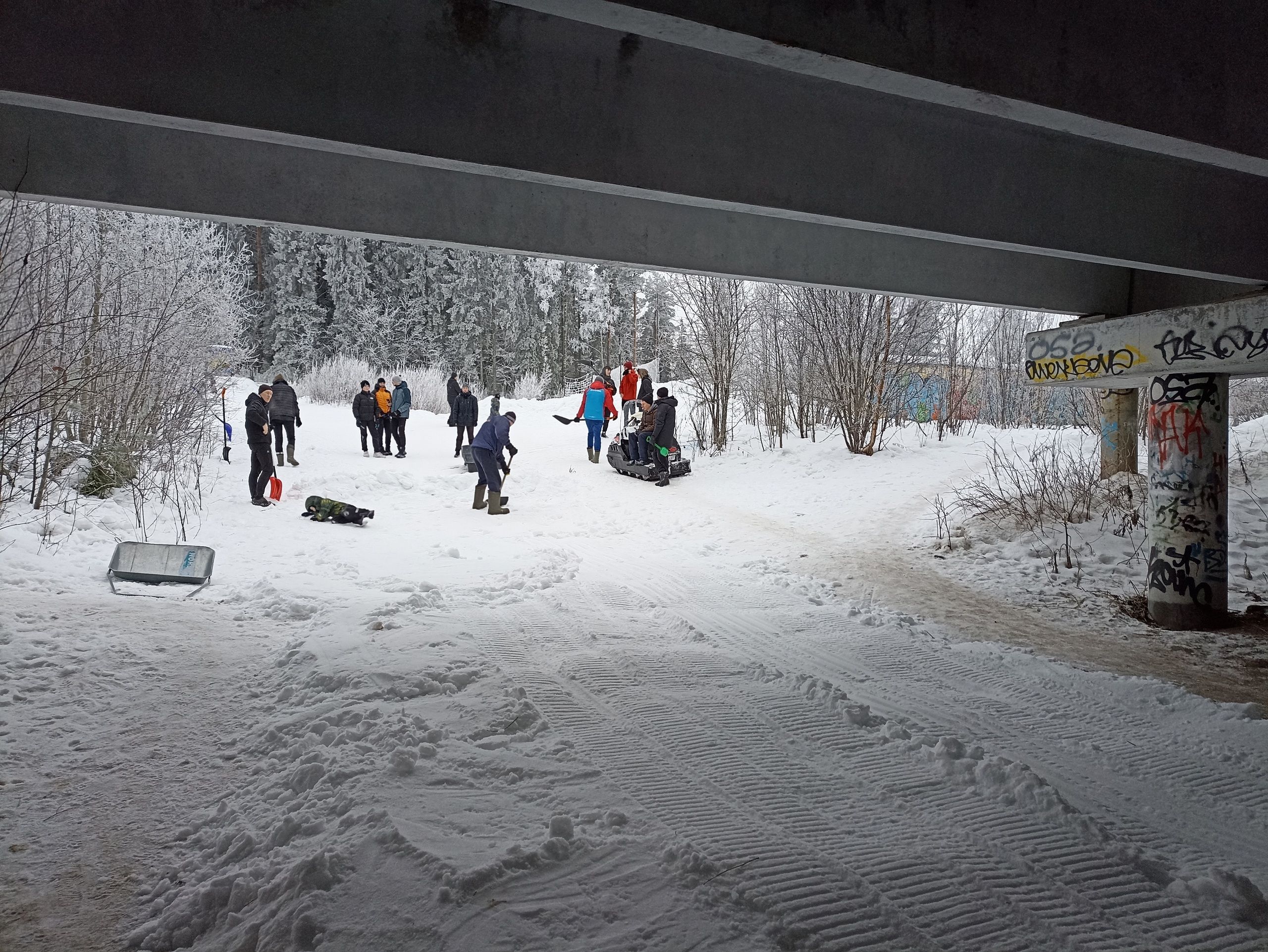 Несмотря на морозную погоду, сама трасса в порядке. Поэтому лыжные прогулки возможны на всем ее протяжении. Добровольцы даже привели в порядок участок под мостом на Лесном проспекте ( у трассы Фонтаны), где не было снега.
