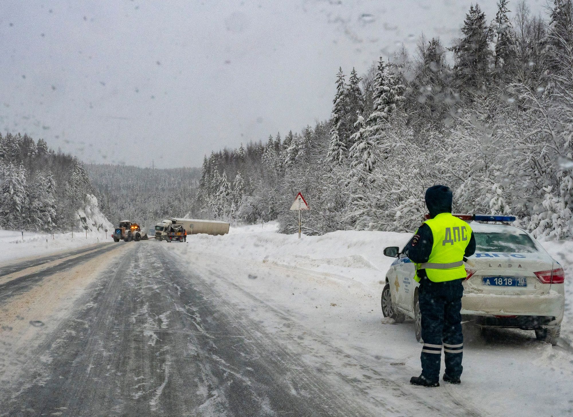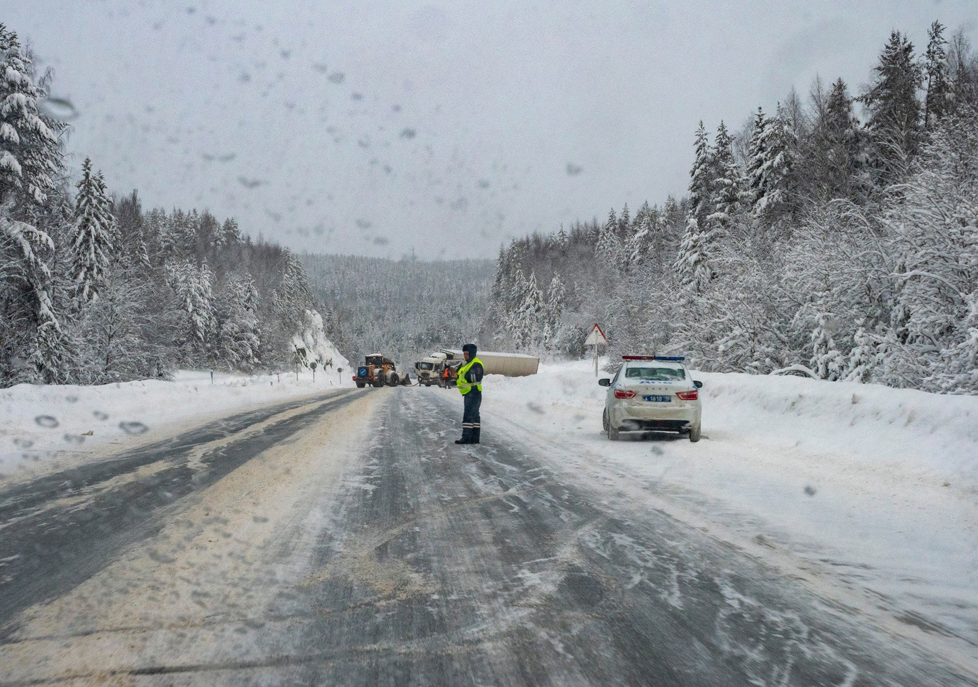 Сегодня, 16 января, на трассе в Карелии водитель фуры не справился с управлением. Транспортное средство занесло, оно заблокировало проезд по дороге.