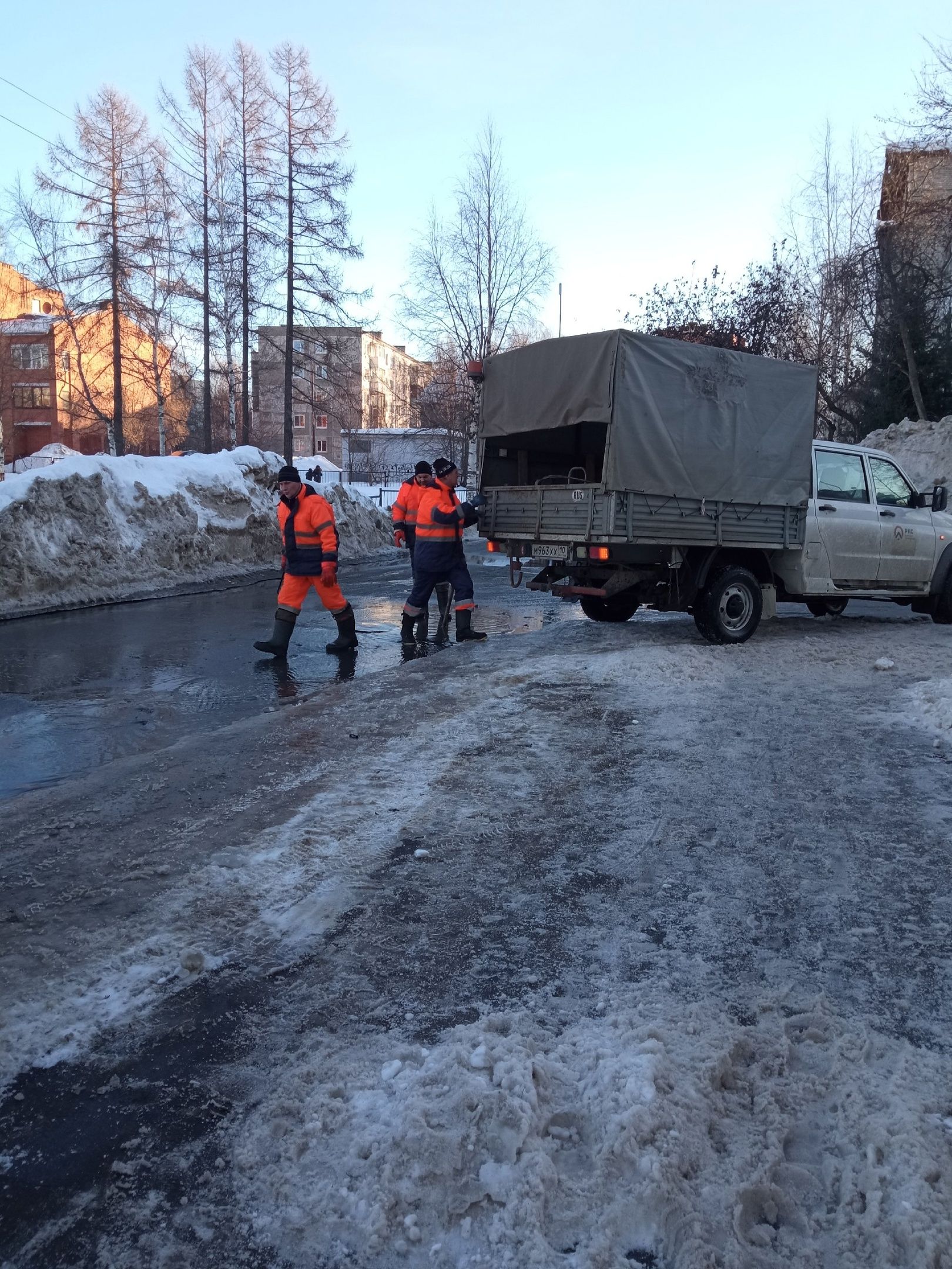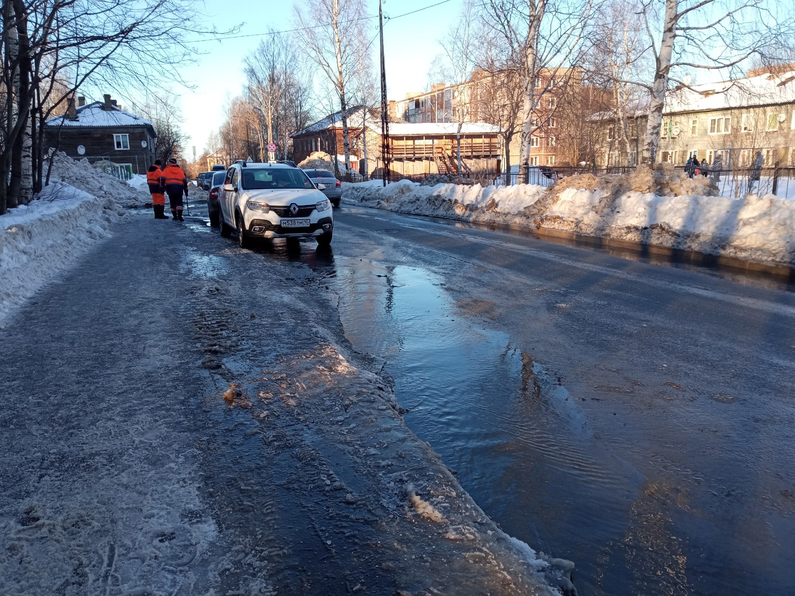 Петрозаводский фотограф Игорь Подгорный побывал на месте происшествия спустя несколько часов после прорыва трубы и поделился свежими снимками. В третьем часу дня рабочие по-прежнему работают над устранением поломки – машину «РКС» и бригаду в спецовках видно в кадре.