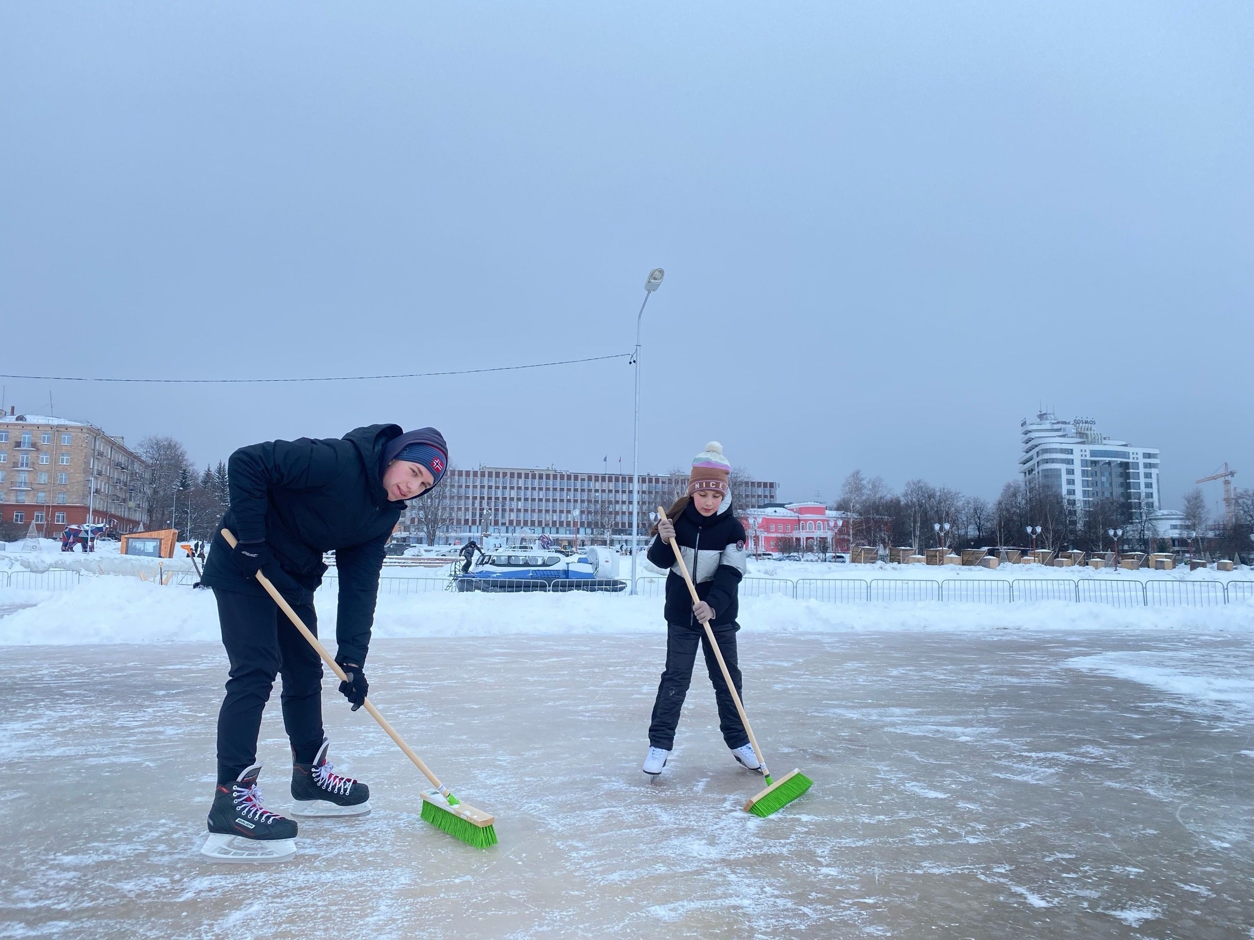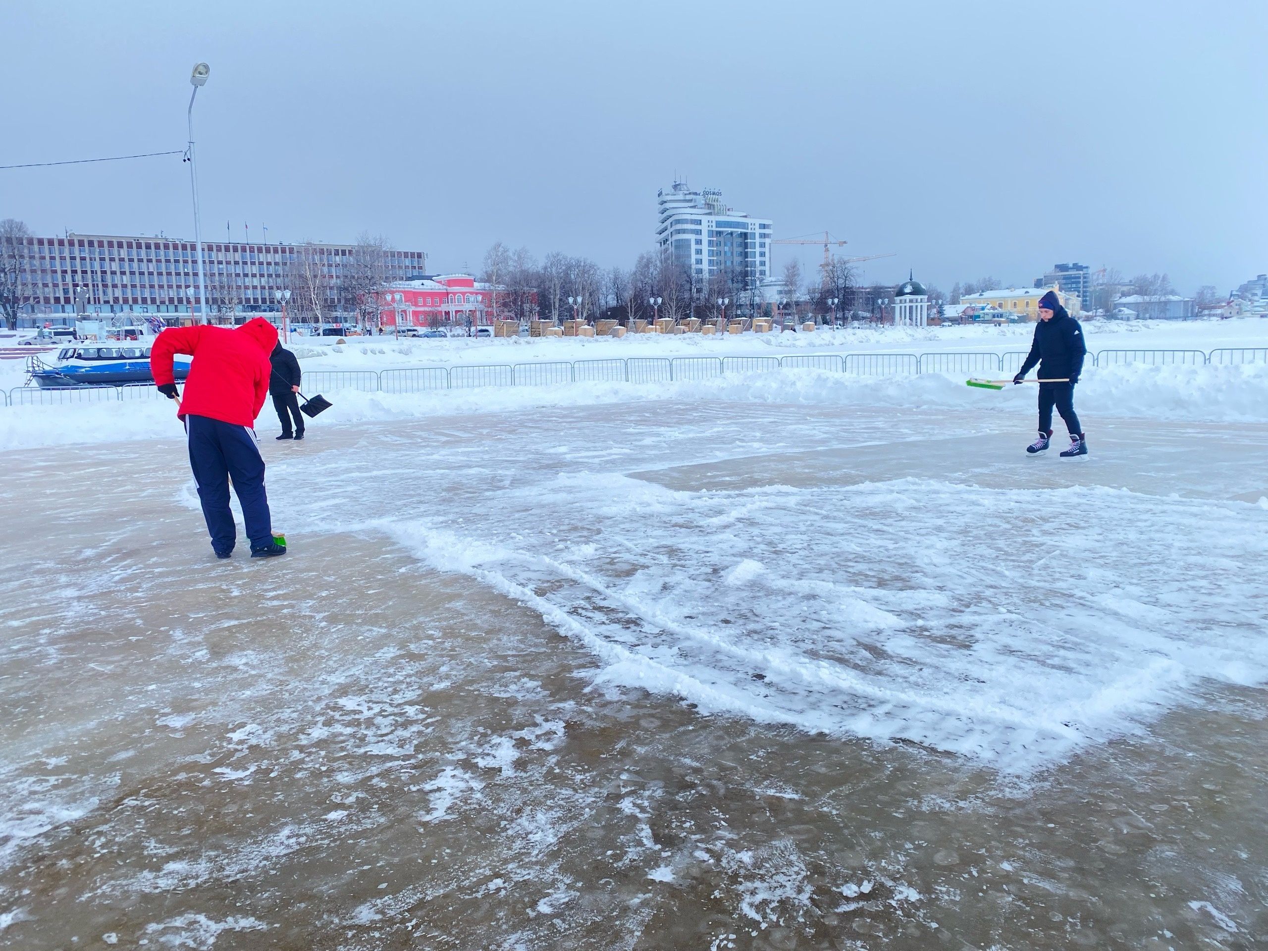Лед еще и сейчас продолжают ровнять. На выходных там планируют провести Чемпионат города по метлохоккею среди семейных команд.