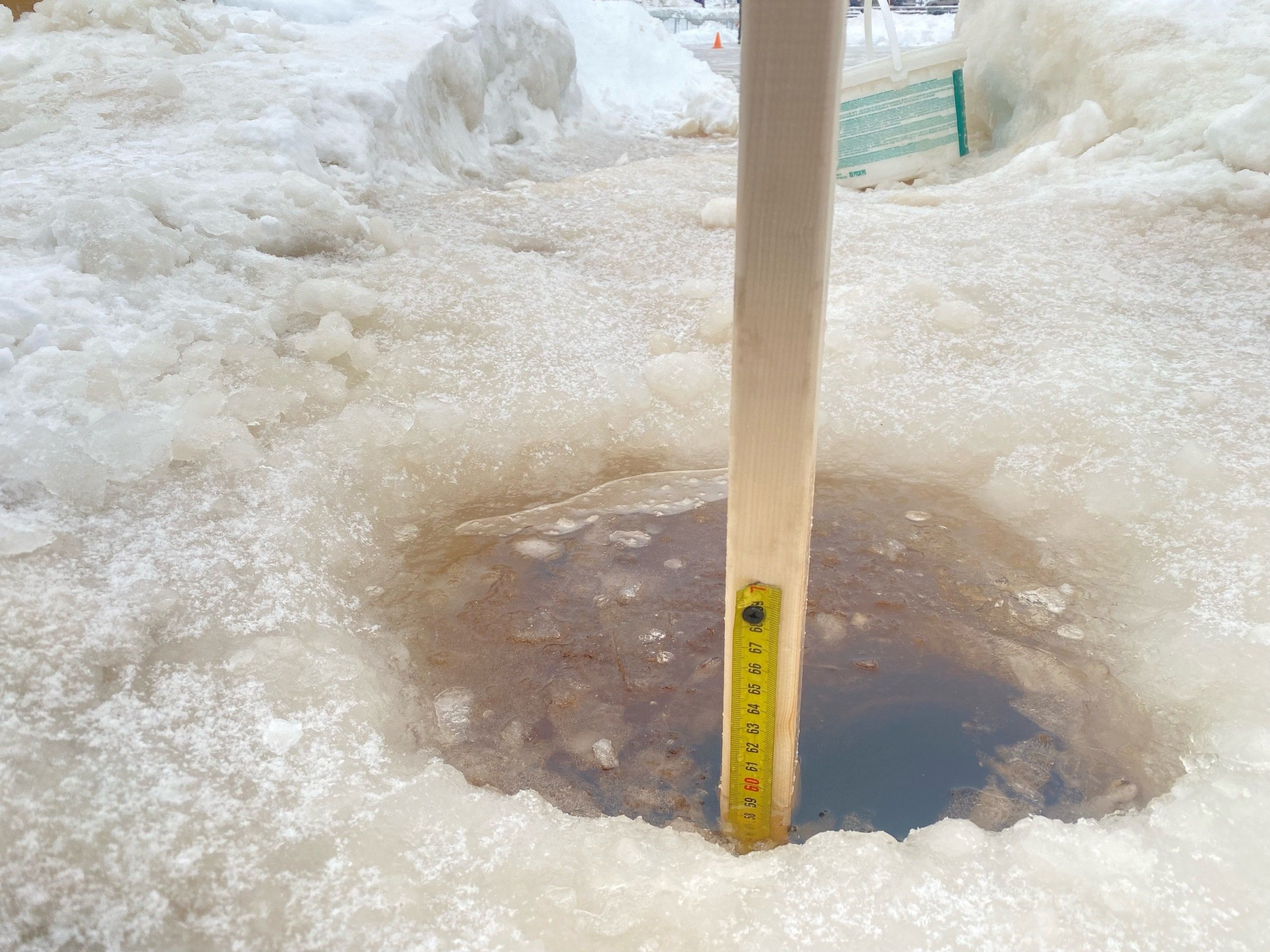 Толщина льда рядом с катком 48 см. Толщина льда в центре катка 57 см. Длина катка 50 метров, ширина 30 метров. Такие габариты катка абсолютно безопасны для массового катания. По технике безопасности и предписанию МЧС каток по периметру ограничен и имеет единую входную зону, — говорится в паблике катка.
