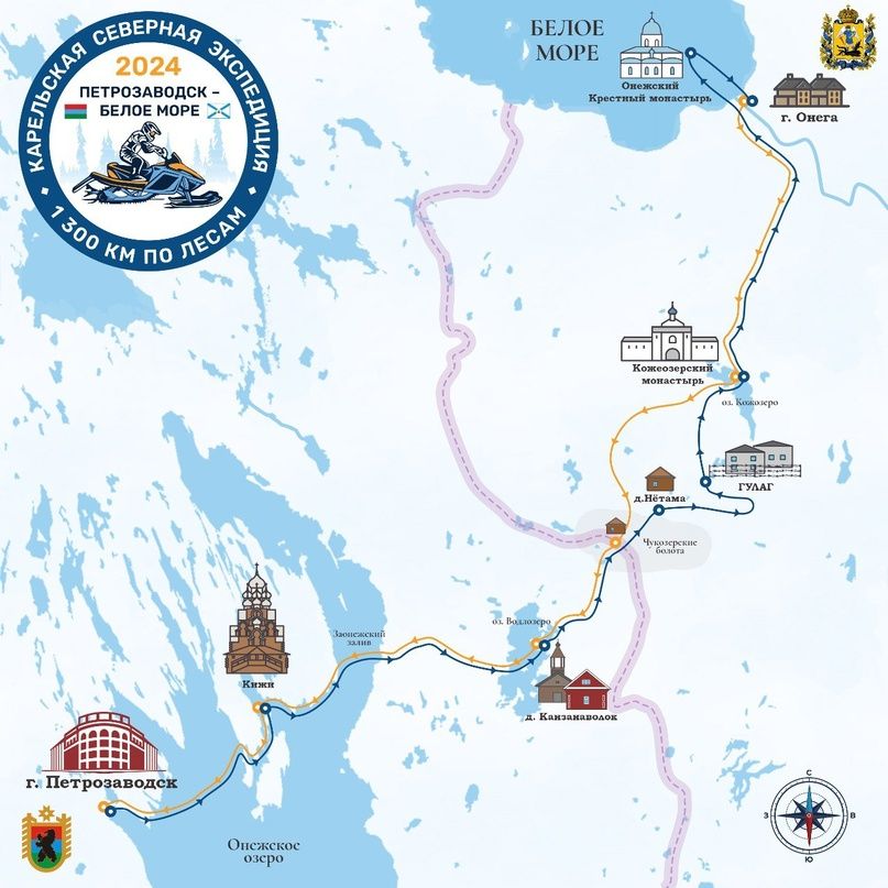 23 февраля стартуем в уникальную экспедицию. 1300 км. по лесам от Петрозаводска до о. Кий в Белом море. А это уже начало Ледовитого океана. Маршрут пролегает через ГУЛАГ, Кожеозерский монастырь (самый труднодоступный действующий монастырь России)», — написал Леонид Белуга.