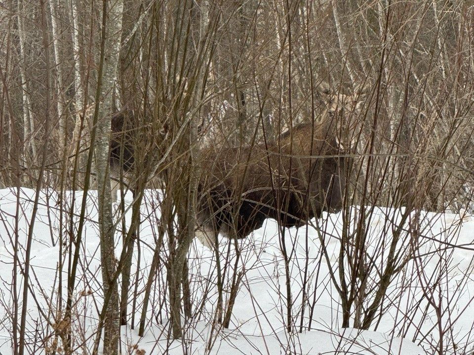 Большой лось стоял прямо у дороги и потом ушел за деревья, мы остановились и сфотографировали их. Возможно, они хотели перейти, но побоялись. Большой лось — это, наверное, мама. Мне так показалось, что она охраняет маленького, — рассказала нашему порталу девушка.