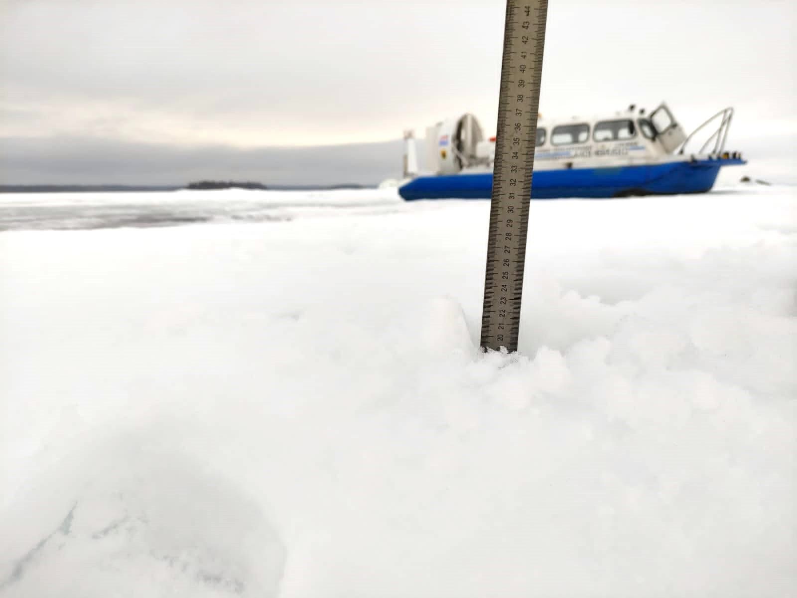 Спасатели Петрозаводского поисково-спасательного отряда провели разведку ледовой обстановки в Онежском озере по маршруту Петрозаводск — деревня Ялгуба — о. Камень Монак — о. Берёзовец — о. Гадий — о. Кудельная Луда.