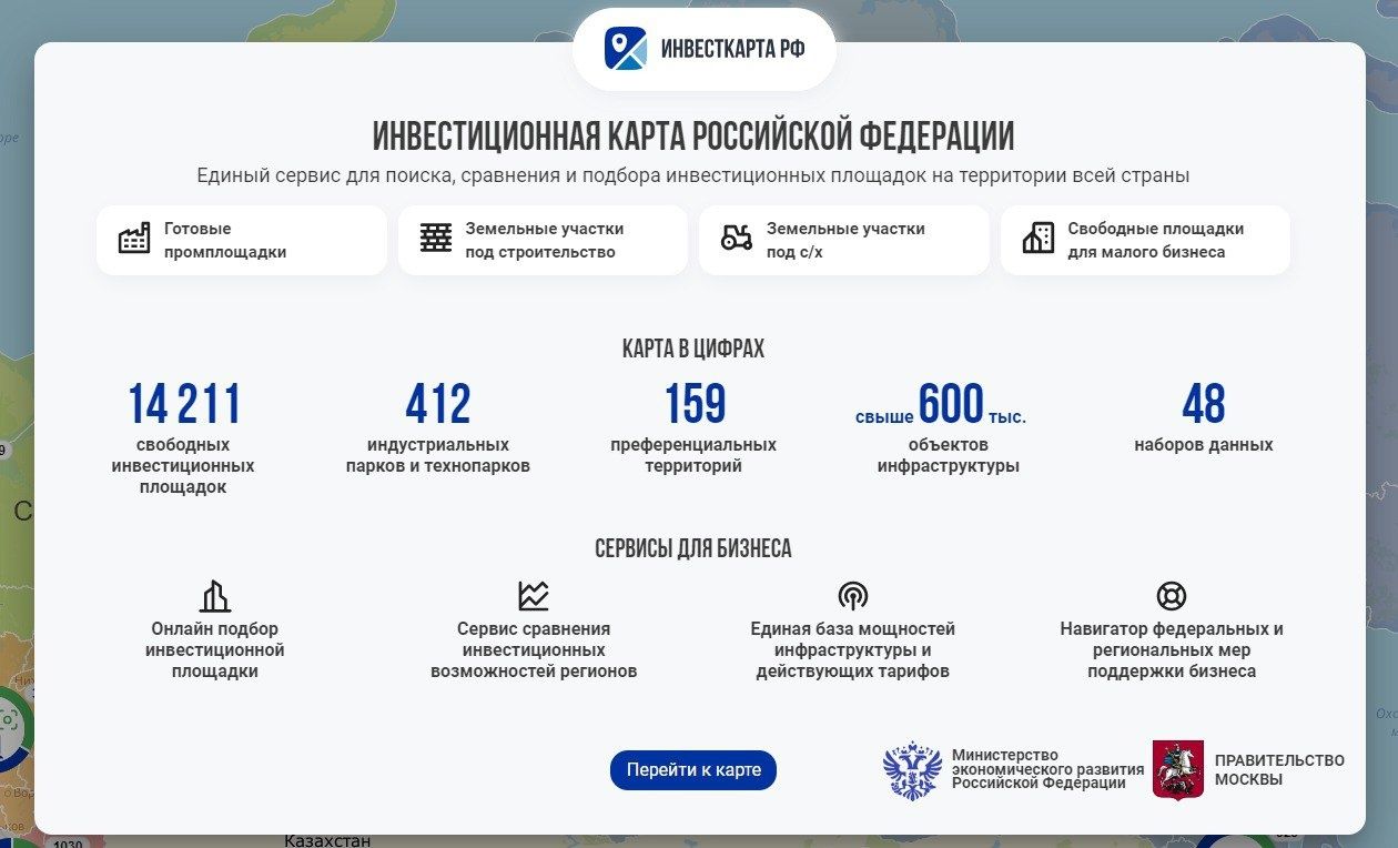 Инвестиционная карта — это единый сервис поиска помещений, зданий или земельных участков для реализации различных инвестиционных проектов в любом регионе страны. Карта позволяет получить подробную информацию о характеристиках площадки, о технологическом присоединении и налоговых льготах, которые можно получить при реализации проекта.