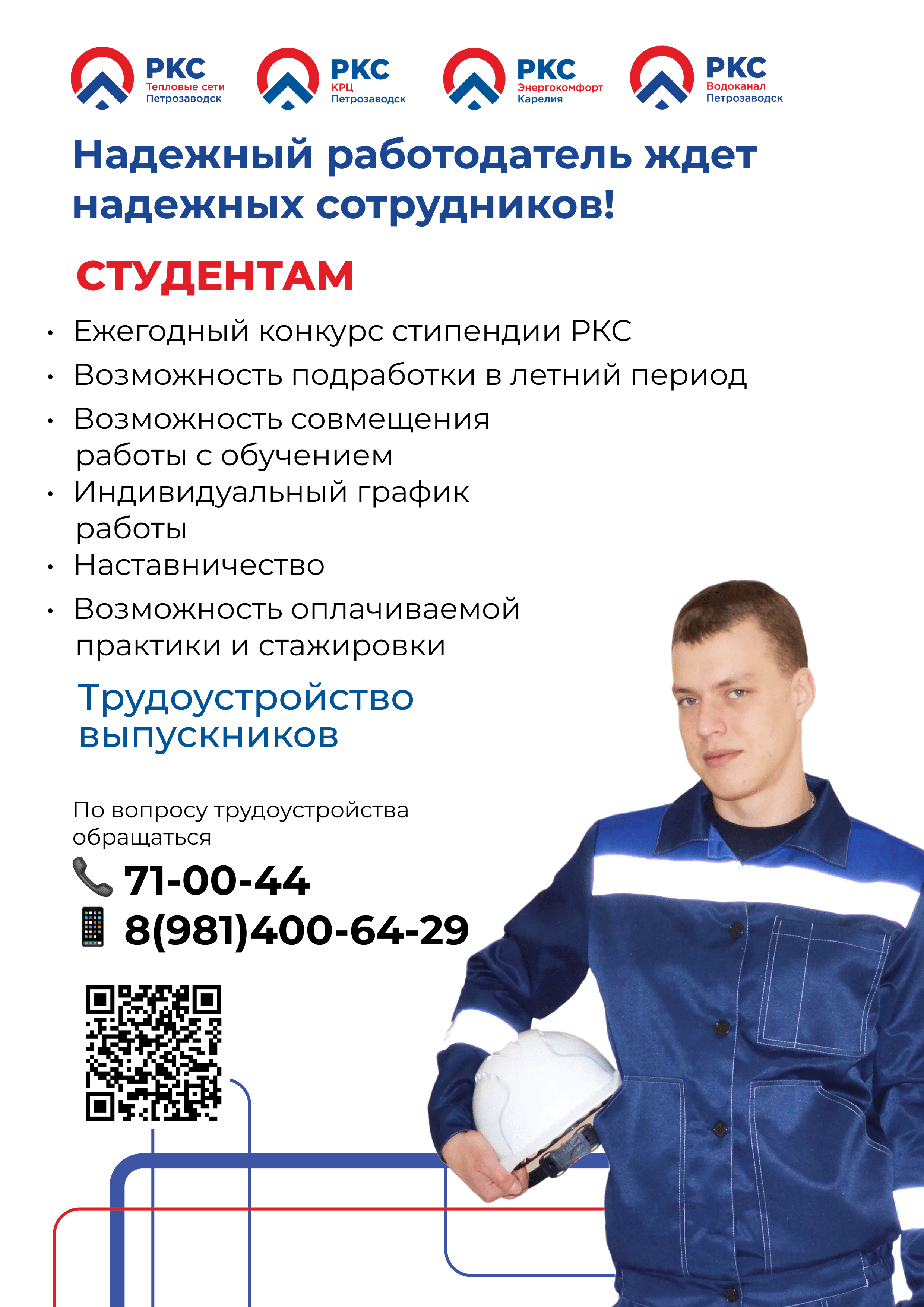 Если студенту понравится в «РКС», его будут ждать на подработку летом. Более того, у ребят, которые учатся в ПетрГУ и Петрозаводском техникуме городского хозяйства, есть возможность получить именную стипендию. Конкурс на нее проходит ежегодно. Победители каждый месяц получают 10 тысяч рублей в качестве поощрения от ГК «РКС-Петрозаводск». Стипендиатам гарантировано трудоустройство после окончания образовательного учреждения.