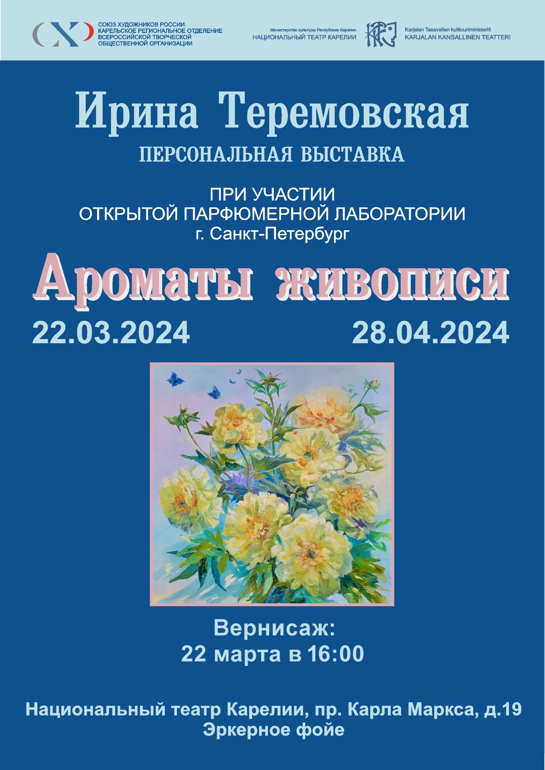 «Ароматы живописи» — персональная выставка Ирины Теремовской, художника, ландшафтного дизайнера и педагога. Член Союза художников России с 1998 года. Выставка «Ароматы живописи» приурочена к юбилею художницы. В экспозицию вошли живописные произведения автора последних лет: натюрморты, портреты, сюжетные картины. Лейтмотивом этой выставки стало искусство ароматов, как два вида искусства – живопись и парфюмерия – влияют друг на друга и на человека, его мироощущение и воображение.
