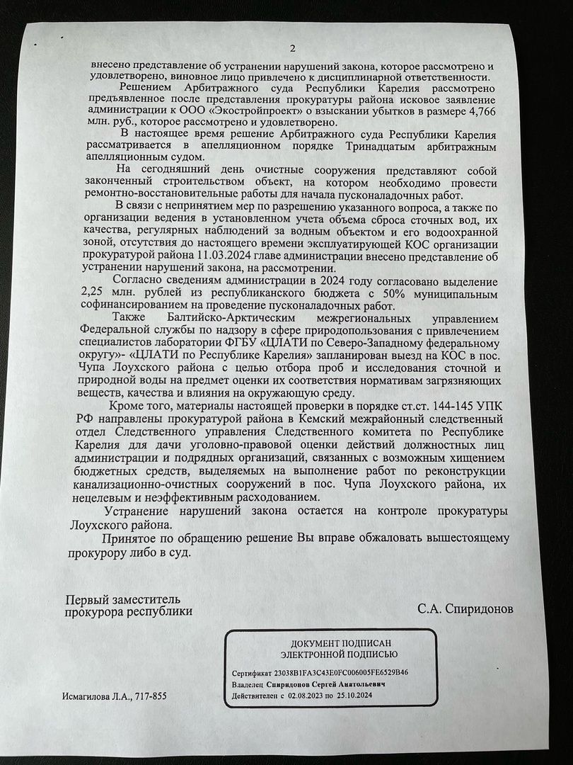 Материалы прокурорский проверки направлены в Кемский следственный отдел СУСК «для дачи уголовно-правовой оценки действий должностных лиц администрации и подрядных организаций, связанных с возможным хищением бюджетных средств, выделяемых на выполнение работ по реконструкции канализационно-очистных сооружений в пос. Чупа Лоухского района, их нецелевым и неэффективным расходованием», сказано в письме надзорного ведомства.