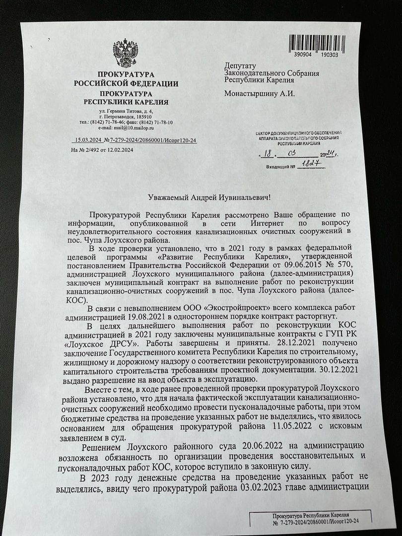 Об этом говорится в ответе прокуратуры республики на запрос депутата Законодательного собрания Карелии Андрея Монастыршина.