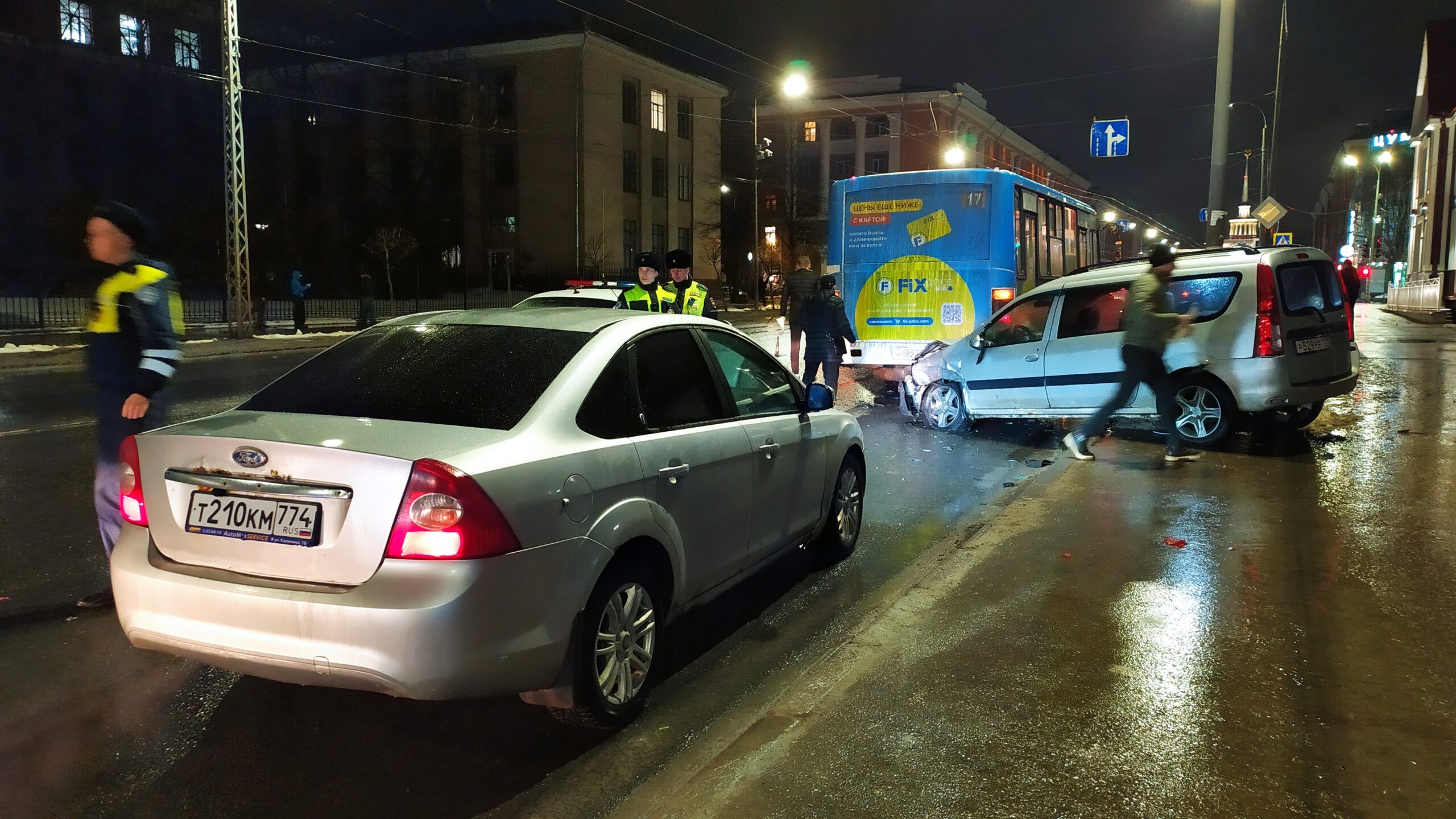 Инцидент попал на городскую камеру видеонаблюдения компании «Ситилинк». Инцидент произошел в 20:37 на проспекте Ленина. На остановке около фонтана «Молекула» легковой автомобиль врезался в два транспортных средства.