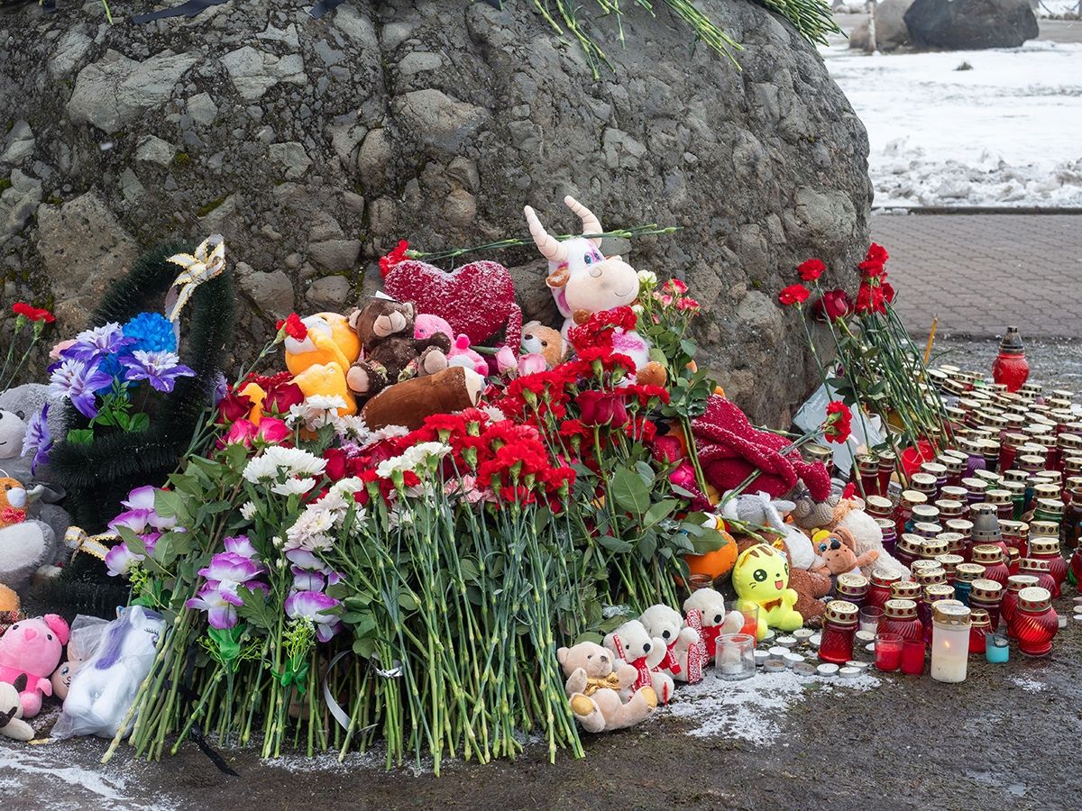 Камень утопает в гвоздиках и розах, а их все продолжают продолжают нести. У основания Камня скорби стоят десятки свечей, которые зажгли в память о погибших, также в знак поддержки люди несут мягкие игрушки.