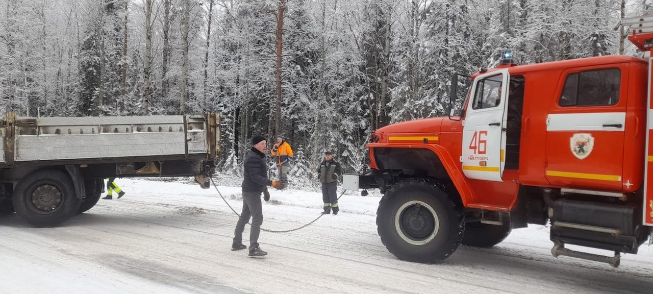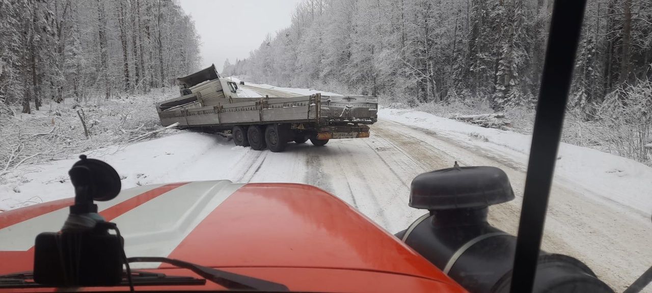 Об этом сообщили в отряде противопожарной службе района. Грузовой тягач с полуприцепом попал в аварию в понедельник недалеко от села Шелтозеро.