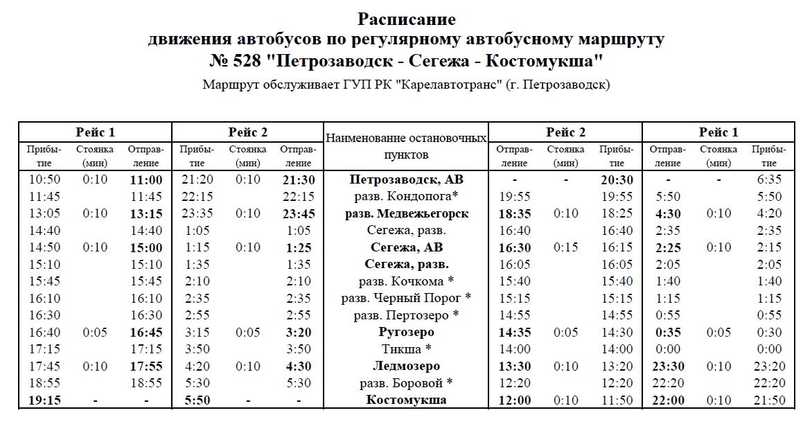 Время отправления автобусов из Петрозаводска и Костомукши остается прежним. Изменяется время прохождения промежуточных остановочных пунктов.