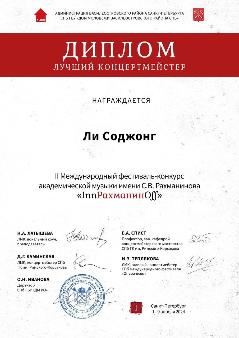 После завершения конкурса наши студенты выступили на гала-концерте, после которого была церемония награждения победителей. Соджонг Ли получила звание лучшего концертмейстера конкурса, а Джунбом стал обладателем Гран-при.