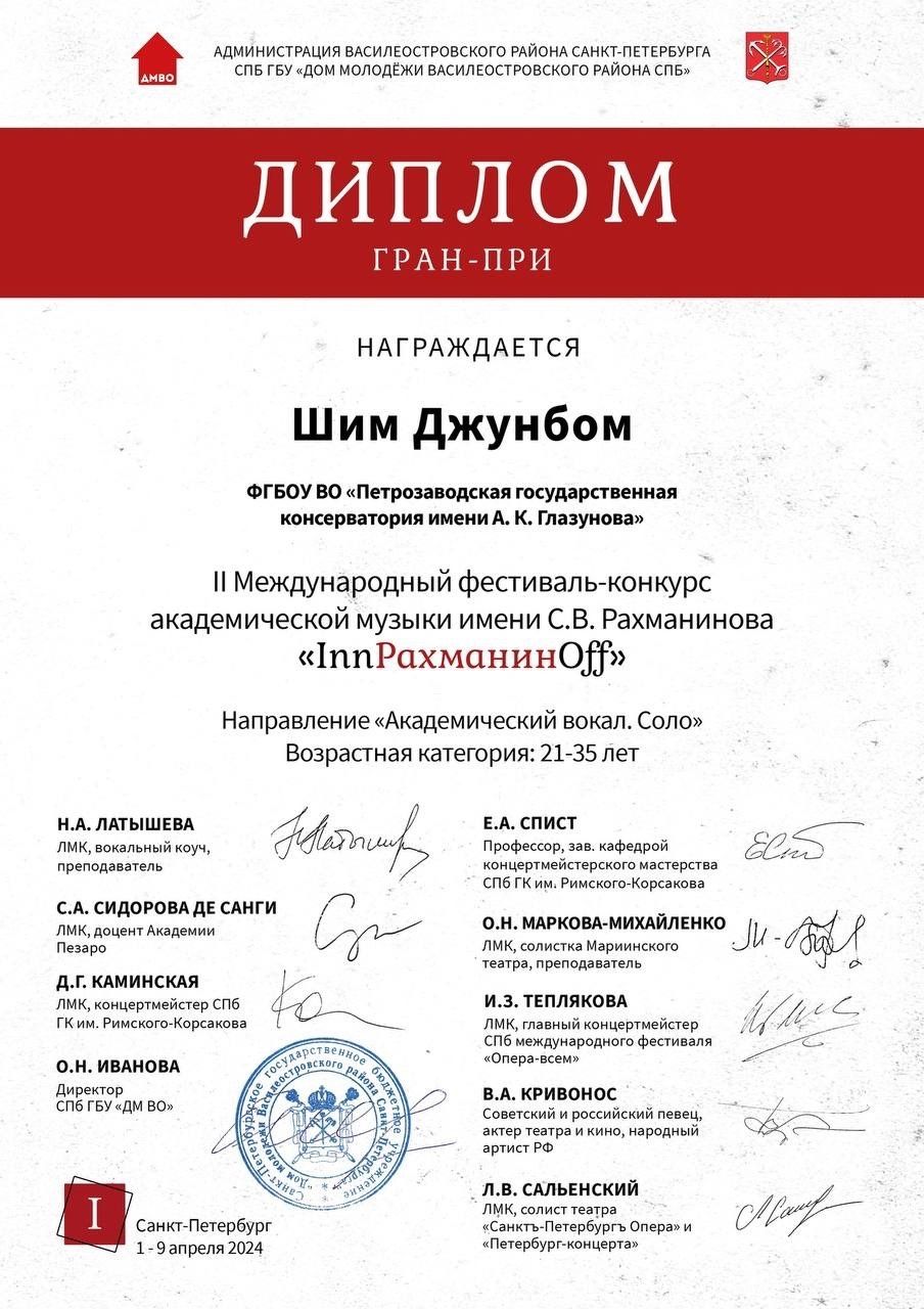 Мы подали заявку в категории «Академический вокал, Соло», 21-35 лет. В качестве моего концертмейстера участвовала моя жена и концертмейстер Петрозаводской государственной консерватории — Соджонг. Конкурс проводился в два тура. Первый — заочный: мы передали видео и свое резюме организаторам конкурса, которые пригласили нас на второй тур очного конкурса в Санкт-Петербург, — рассказал нашему порталу Джунбом Шим.