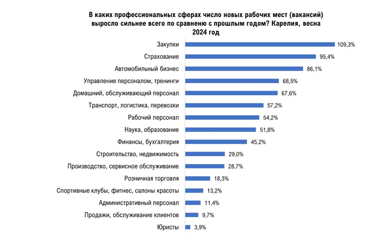 Больше всего в Карелии выросла потребность в специалистах по закупкам (на 109%), персонал в сфере страхования (на 95%) и автобизнесе (на 86,1%). Резко увеличилось количество вакансий для домашнего, обслуживающего персонала, специалистов в сфере транспорта, логистики и перевозок, рабочий персонал.