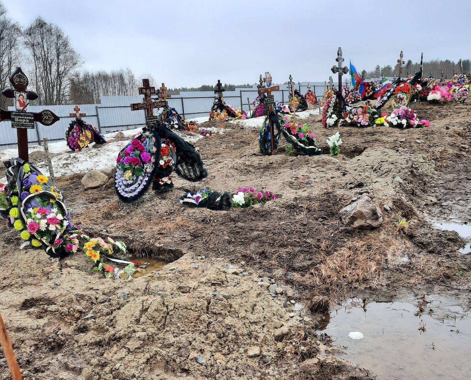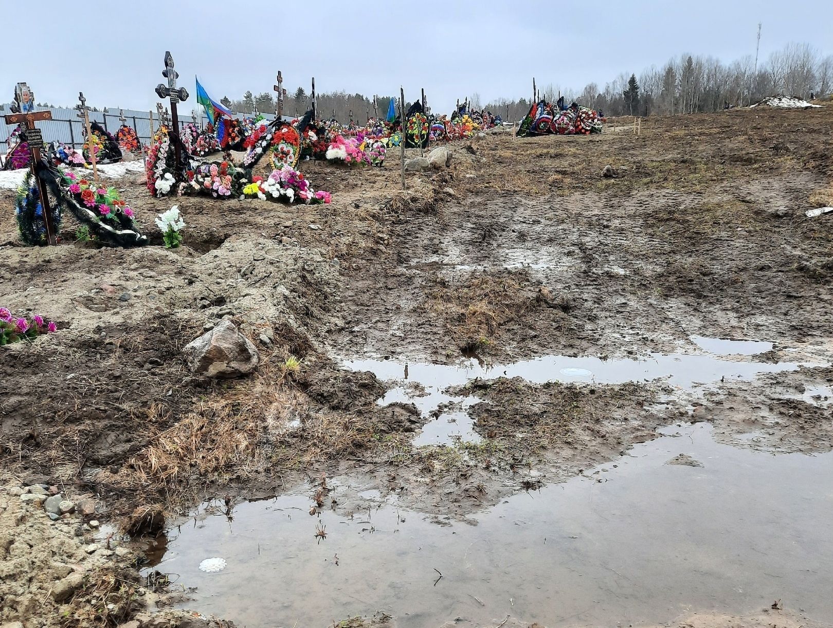 Скажите, как можно хоронить людей на таком кладбище? Туда даже зайти невозможно. Приезжали из другого города на похороны и ужаснулись. Могилы уходят, кресты падают ,а бедные копщики перед каждыми похоронами черпают воду ведром из могилы. На похороны нужно ходить в болотных сапогах, — говорит автор поста и показывает фото.
