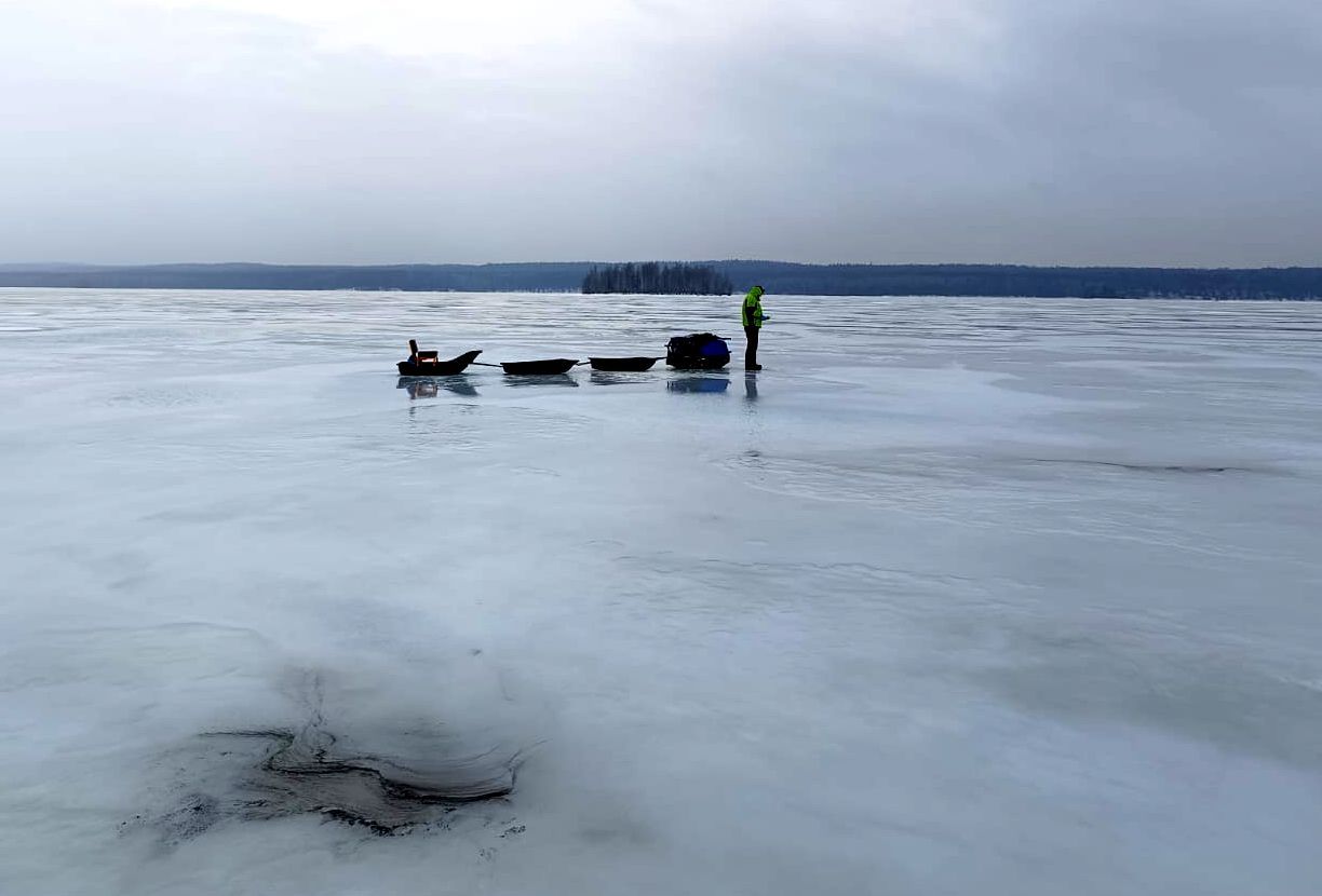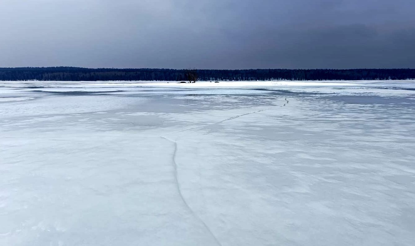 Мы ехали на мотобуксировщике, он же мотособака, по Онежскому озеру в Кижских шхерах. На большой воде лед был толстый и более-менее крепкий. Ближе к берегам и между островов, рыбаки знают, лучше не гонять. А если не избежать этого – надо смотреть в оба и не попасть на подмываемый течениями лед, в размытую майну или просто не выскочить на открытую воду, бывает и такое.