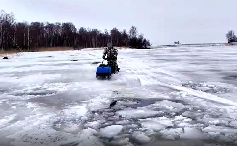 Мотособака успевает зацепиться за более надежный лед впереди, ревет, гребет от полыньи. Но лед проваливается быстрее, в итоге в нашем паровозике из санок и буксировщика появляется критичный угол. Санки внезапно отстегиваются от техники, которая вместе с водителем, вцепившимся в спасительный руль, улетает на безопасный участок.