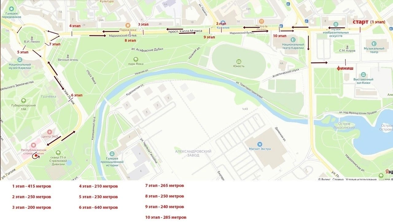 Маршрут пройдёт по центральным улицам Петрозаводска и будет состоять из 10 этапов длиной чуть более 3 километров. Самый длинный этап — 640 метров, самый короткий — 200 метров. Старт и финиш эстафеты — на площади Кирова.