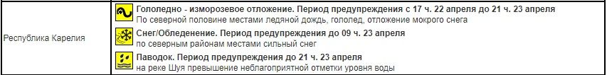 До утра 23 апреля также будет действовать предупреждение о сильном снегопаде. Осадки ожидаются местами на севере Карелии.