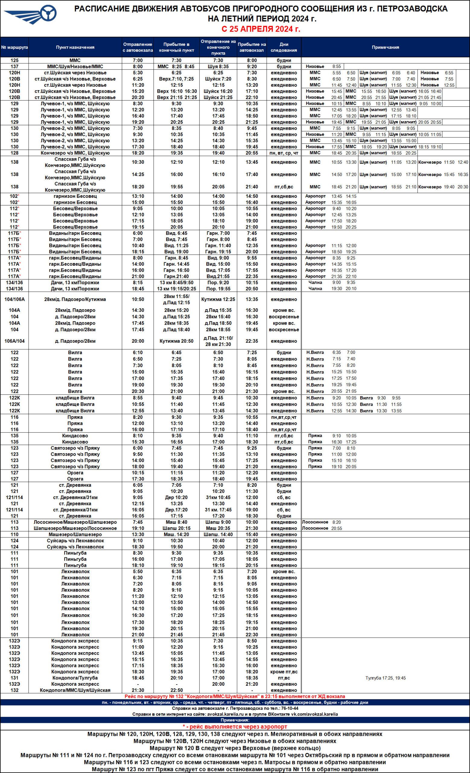 С 25 апреля вводится весенне-летнее расписание рейсов автовокзала. Об этом сообщил паблик «Карелавтотранс».