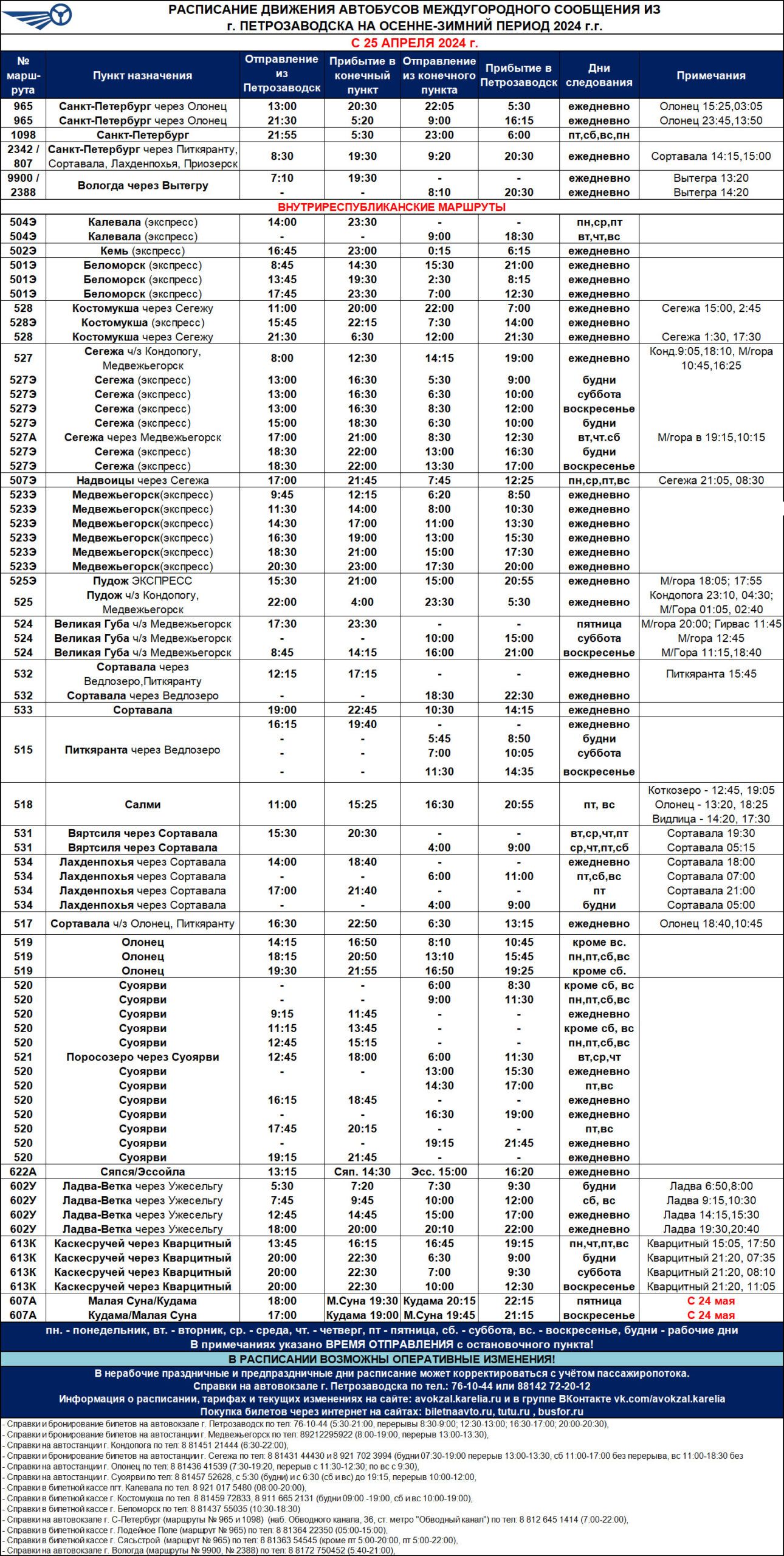 С 25 апреля вводится весенне-летнее расписание рейсов автовокзала. Об этом сообщил паблик «Карелавтотранс».
