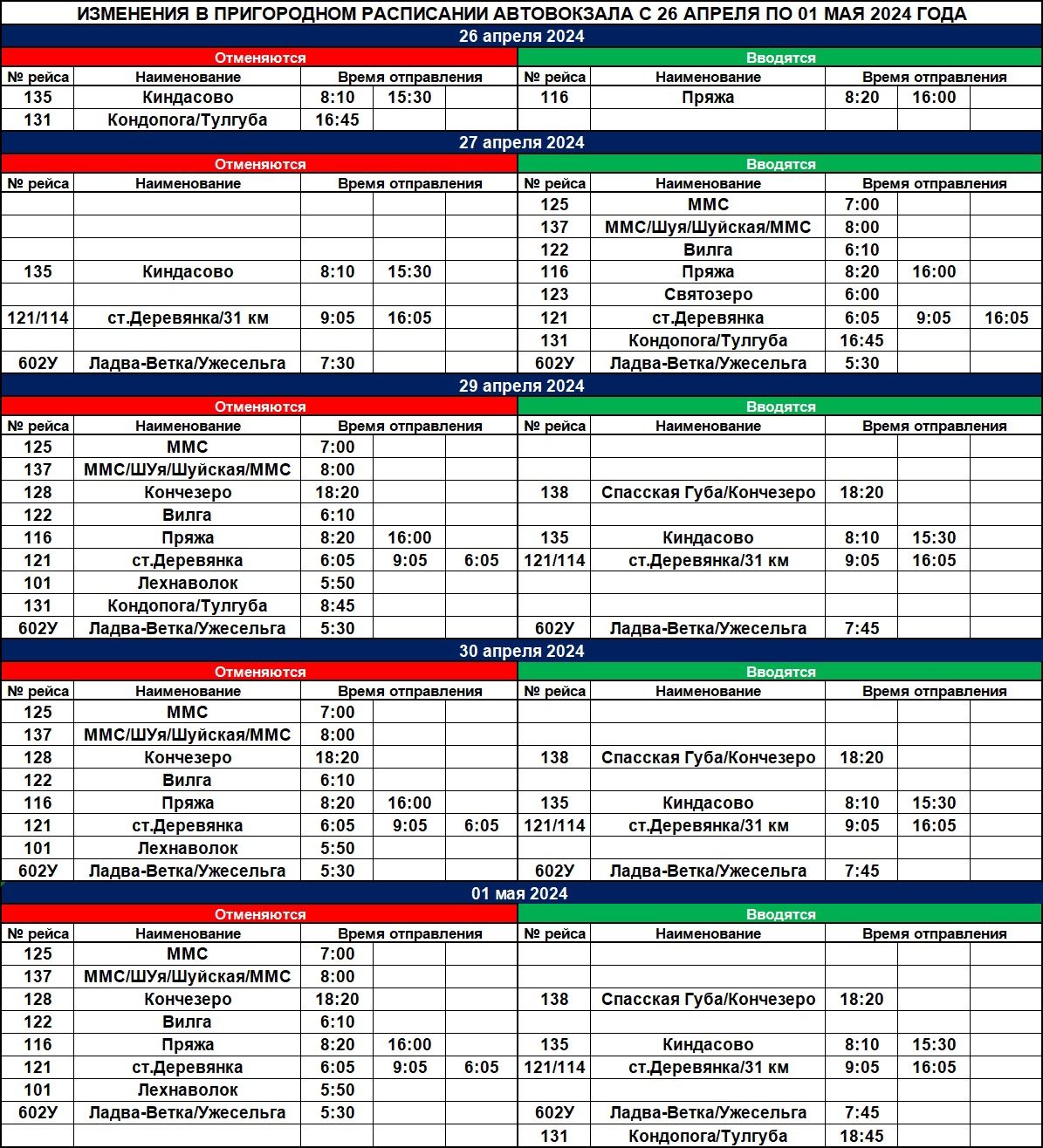 В праздничные дни изменится расписание автовокзала в Петрозаводске Новости Общество 24 апреля, 2024 20:00 Часть рейсов отменят, будут назначены новые. В расписание автовокзала Петрозаводска внесли коррективы. Об этом сообщил паблик ГУП РК «Карелавтотранс». Расписание изменится с 26 апреля по 1 мая. Многие рейсы отменят, но будет введено несколько новых. Напомним, ранее было опубликовано летнее расписание автовокзала.