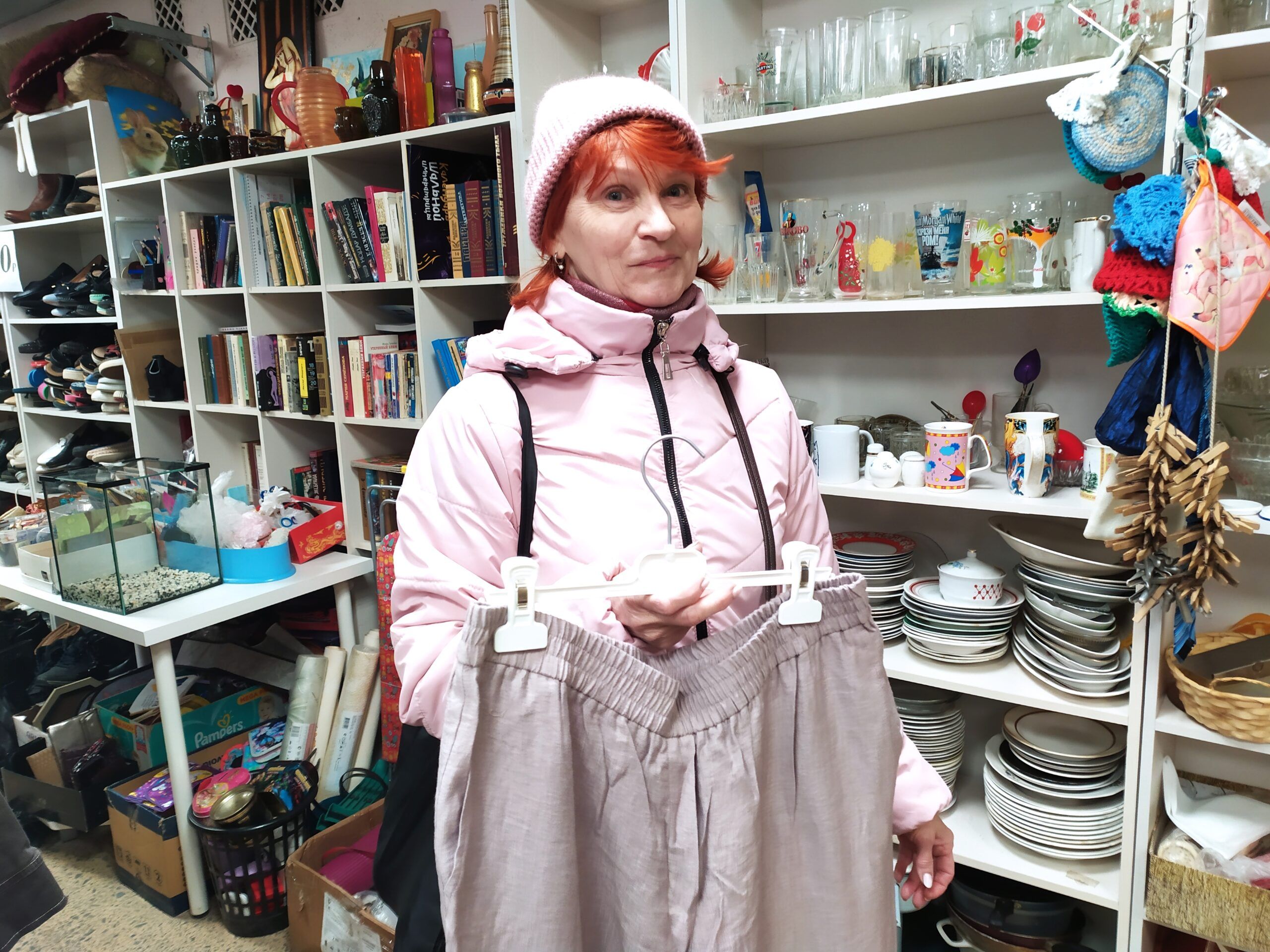 Уже на выходе из магазина встречаем постоянную покупательницу. Среди множества отобранных волонтерами вещей она выискивает одежду для себя и внуков.