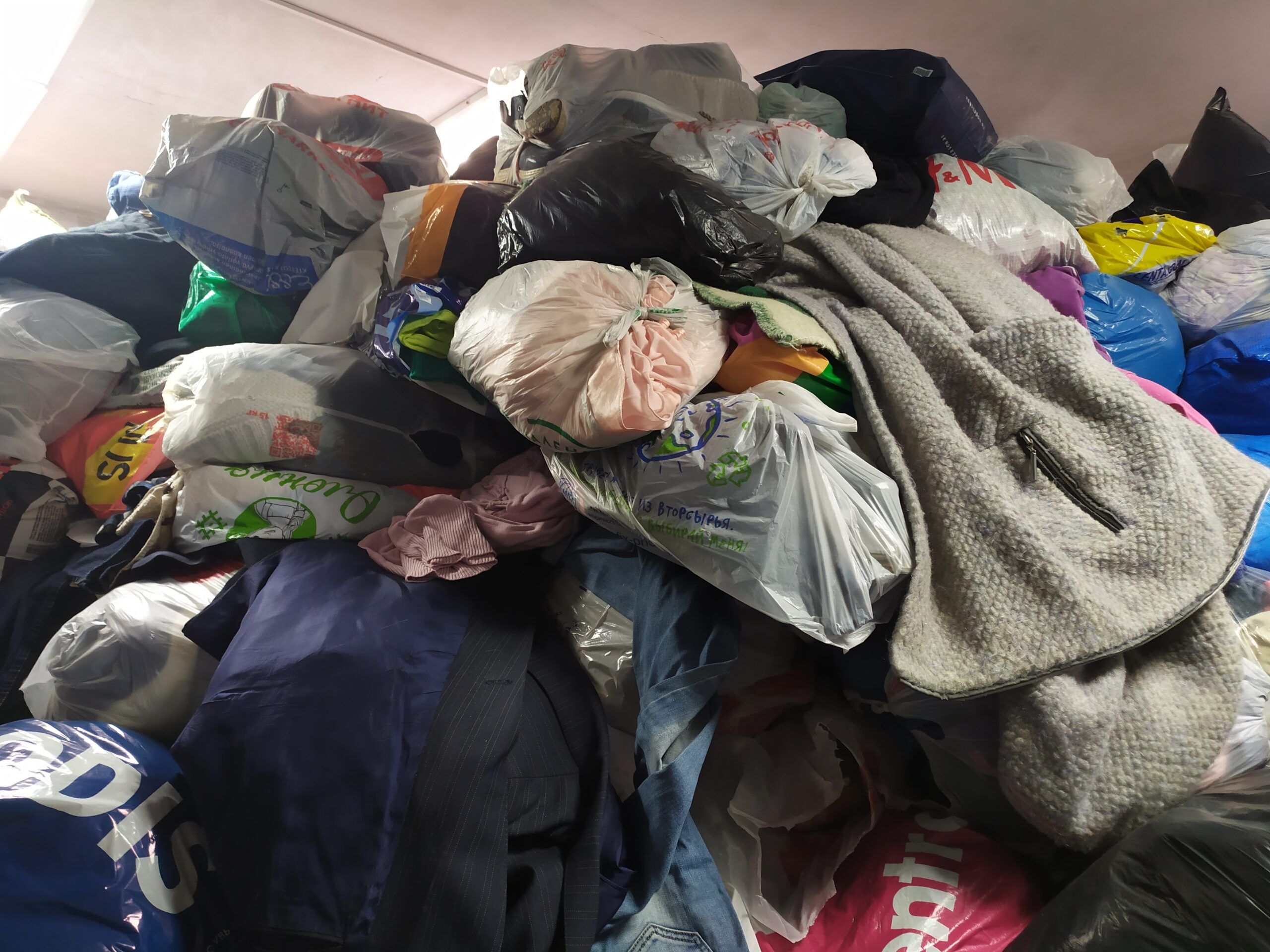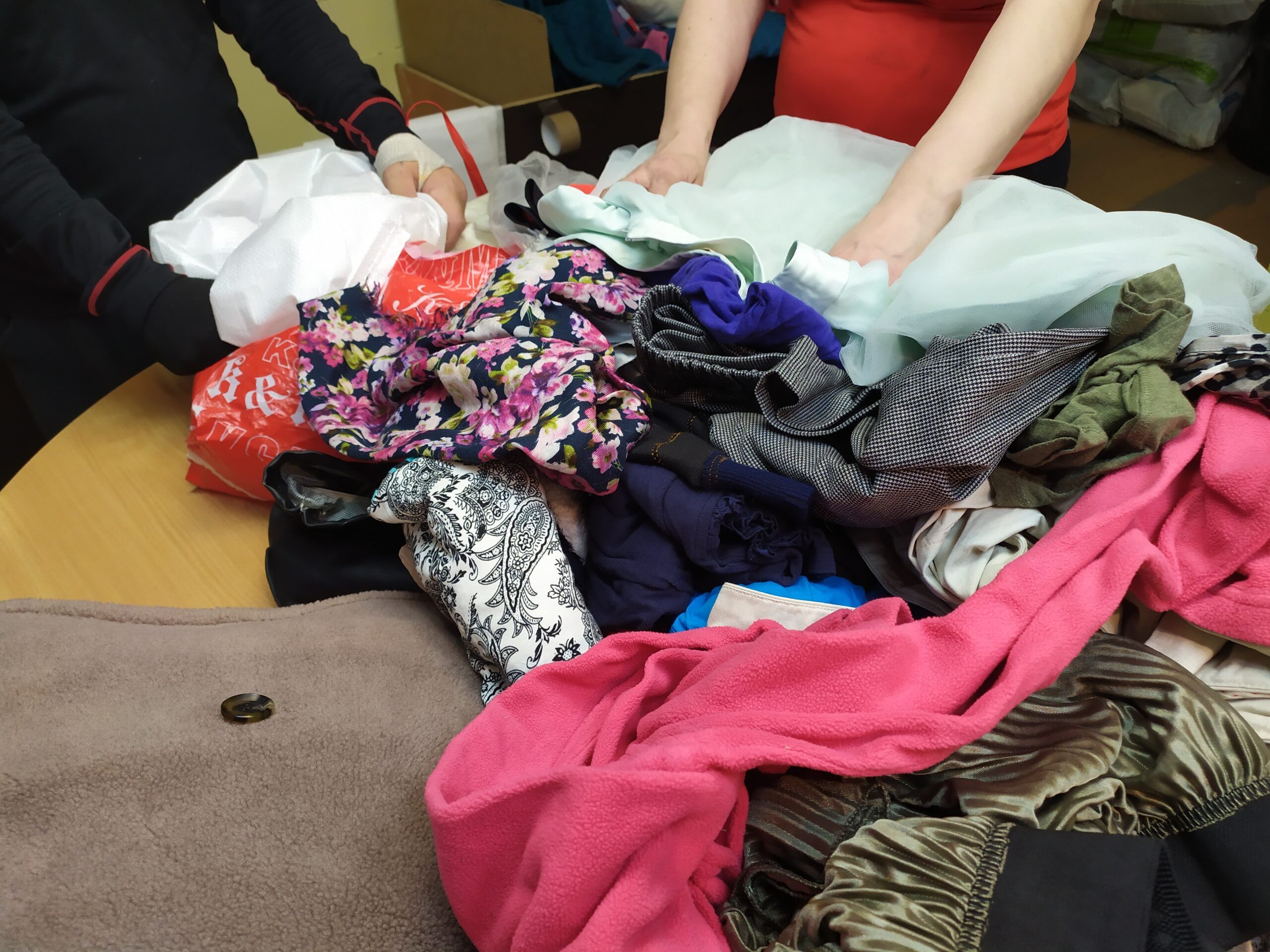 Нас приглашают к сортировочному столу. Уже вечер, поэтому большая часть поступивших вещей разобрана. Оставшееся делим на фракции: