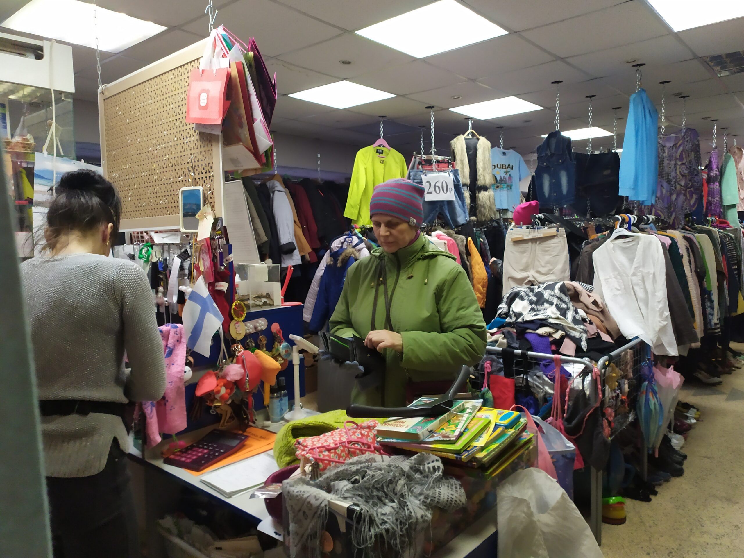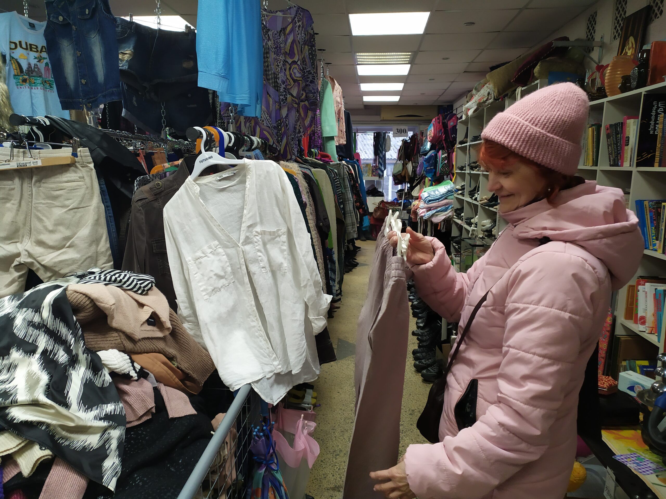 Уже на выходе из магазина встречаем постоянную покупательницу. Среди множества отобранных волонтерами вещей она выискивает одежду для себя и внуков.