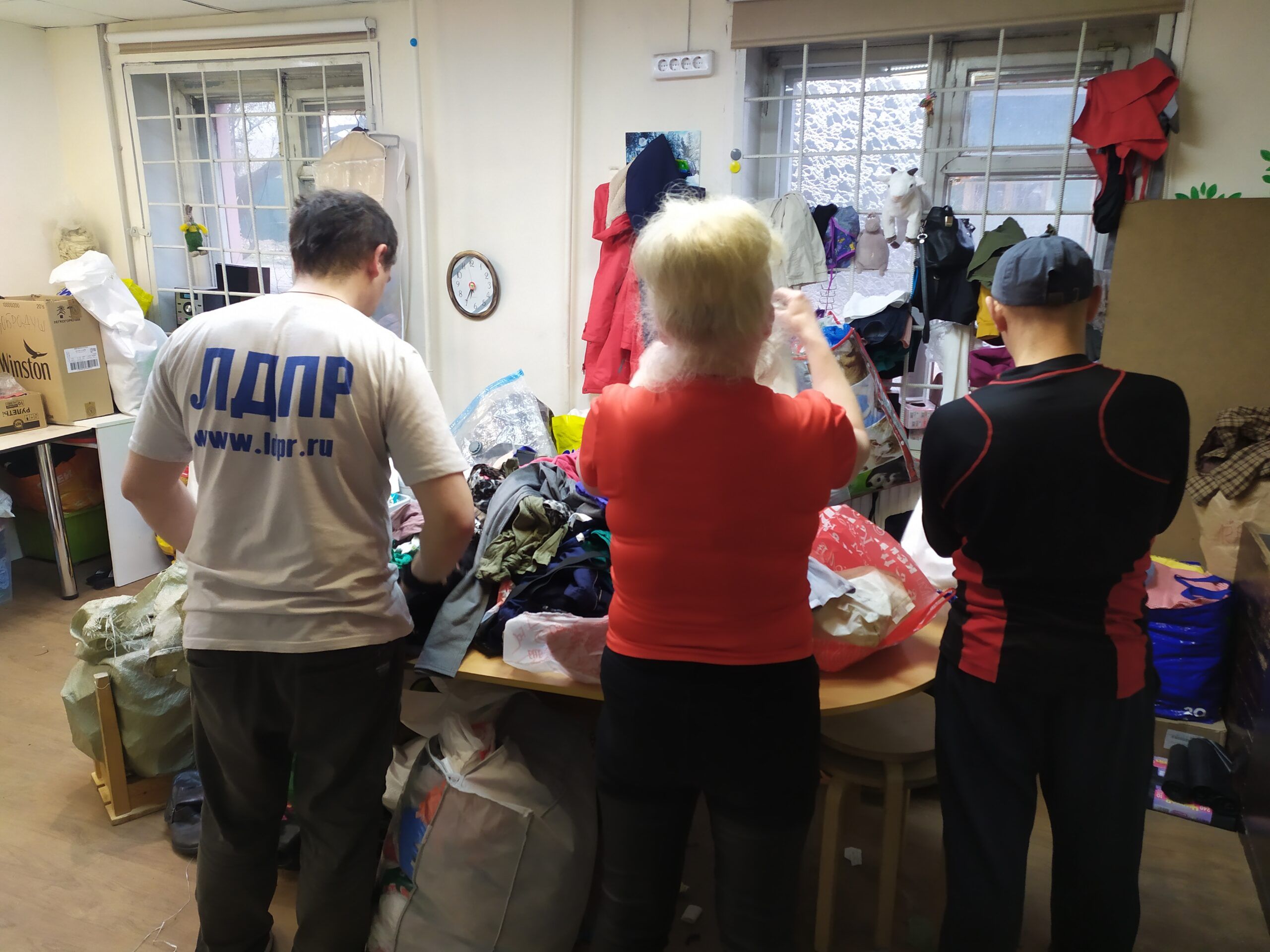 Руководитель центра Любовь с улыбкой встречает нас и ведет к волонтерам, которые на столе разбирают мешки с вещами. С 10 утра до 20:00. Каждый — не меньше десяти за день. Среди них женщина — руководитель компании, мужчина с инвалидностью, подопечный Центра социальной адаптации «Другой формат». Всего в центре шесть постоянных волонтеров, есть те, кто приходит, когда может. Это люди разного возраста – от студентов до пенсионеров. Все они хотят помогать.